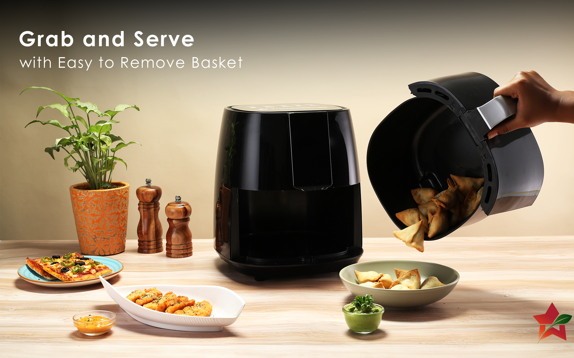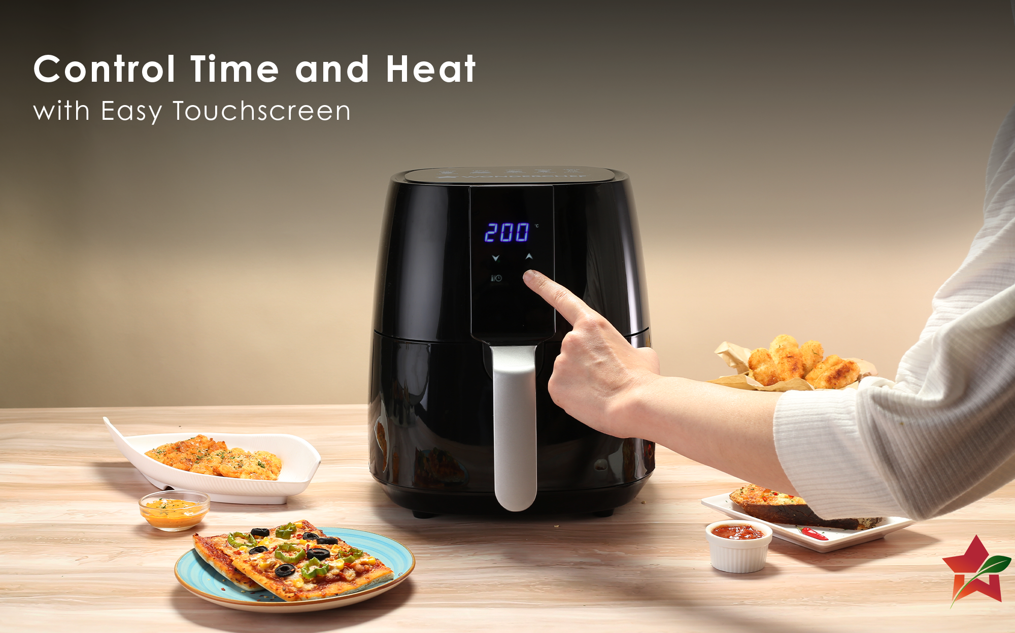 Focused on healthy living, Prato Air Fryer is a must have in every kitchen. This air fryer serves the whole family, makes your cooking effortless and is suitable for every occasion. The compact air fryer has a digital touch screen for time and temperature control functions and also an auto shut-off feature that lets you know when your food is ready. It comes with a 3.8 Liters non-stick food basket which is easy to clean and maintain. fry with almost zero oil – French Fries, Potato chips, Spring Rolls, Fried Veggies, sausage Rolls, Nuggets, and more.