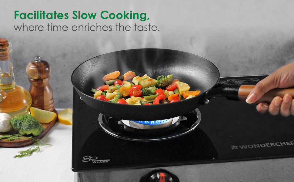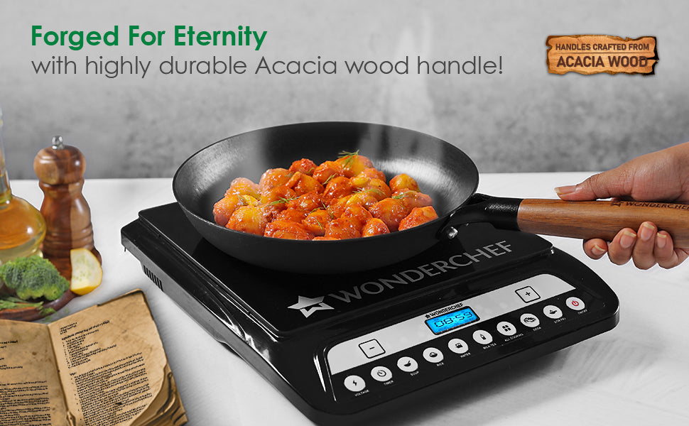 Wonderchef Ferro Light Weight Cast-iron Cookware Range is a lighter version of the classic cast-iron cookware. The unique Gravity Moulding Technology casts the pans with a sand mould which helps make the cookware lighter. The cookware features handles made of Acacia wood adding convenience. Use these pans for stir-frying, sauteing, roasting, slow cooking and much more!
