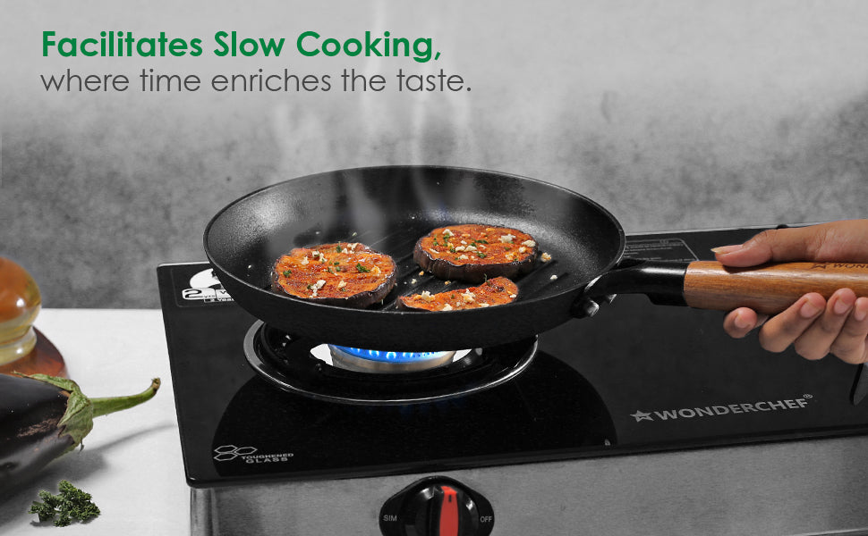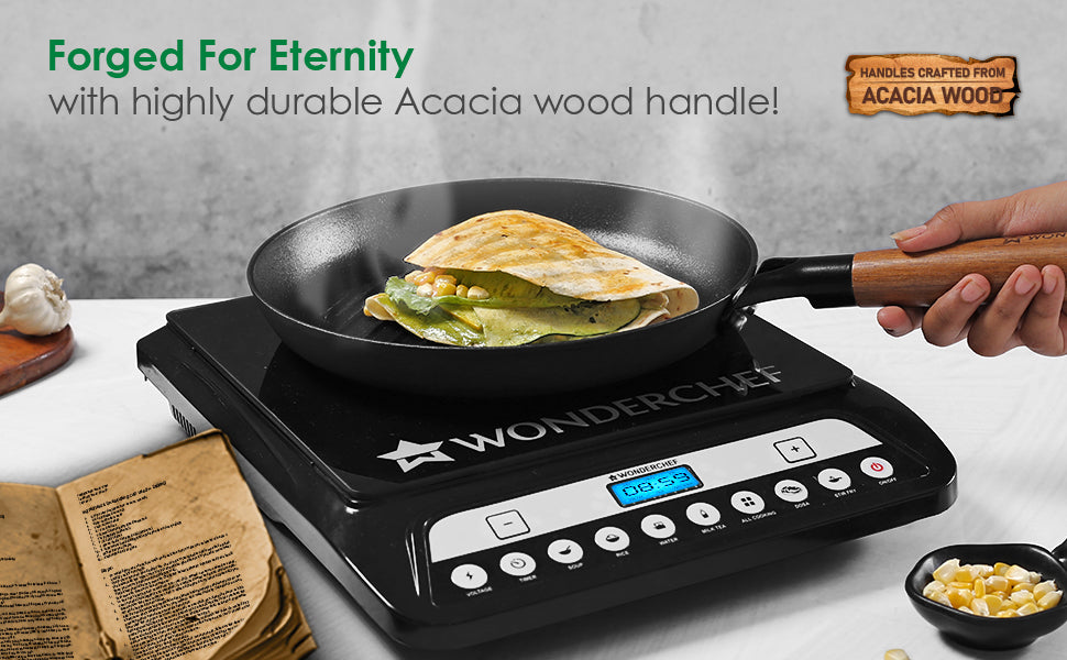 Wonderchef Ferro Light Weight Cast-iron Cookware Range is a lighter version of the classic cast-iron cookware. The unique Gravity Moulding Technology casts the pans with a sand mould which helps make the cookware lighter. The cookware features handles made of Acacia wood adding convenience. Use these pans for stir-frying, sauteing, roasting, slow cooking and much more!