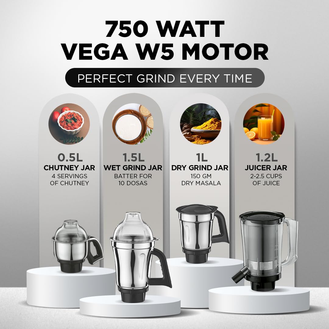 - 750W Vega W5 Motor that can grind turmeric in just 2 min ; Speed Controls: 3 Speed ; Voltage: 230V AC ~ 50 Hz ; Material of Body: A.B.S ; Flex Cord: PVC insulated 3 Core, Flexicord with Plugtop & earthing
