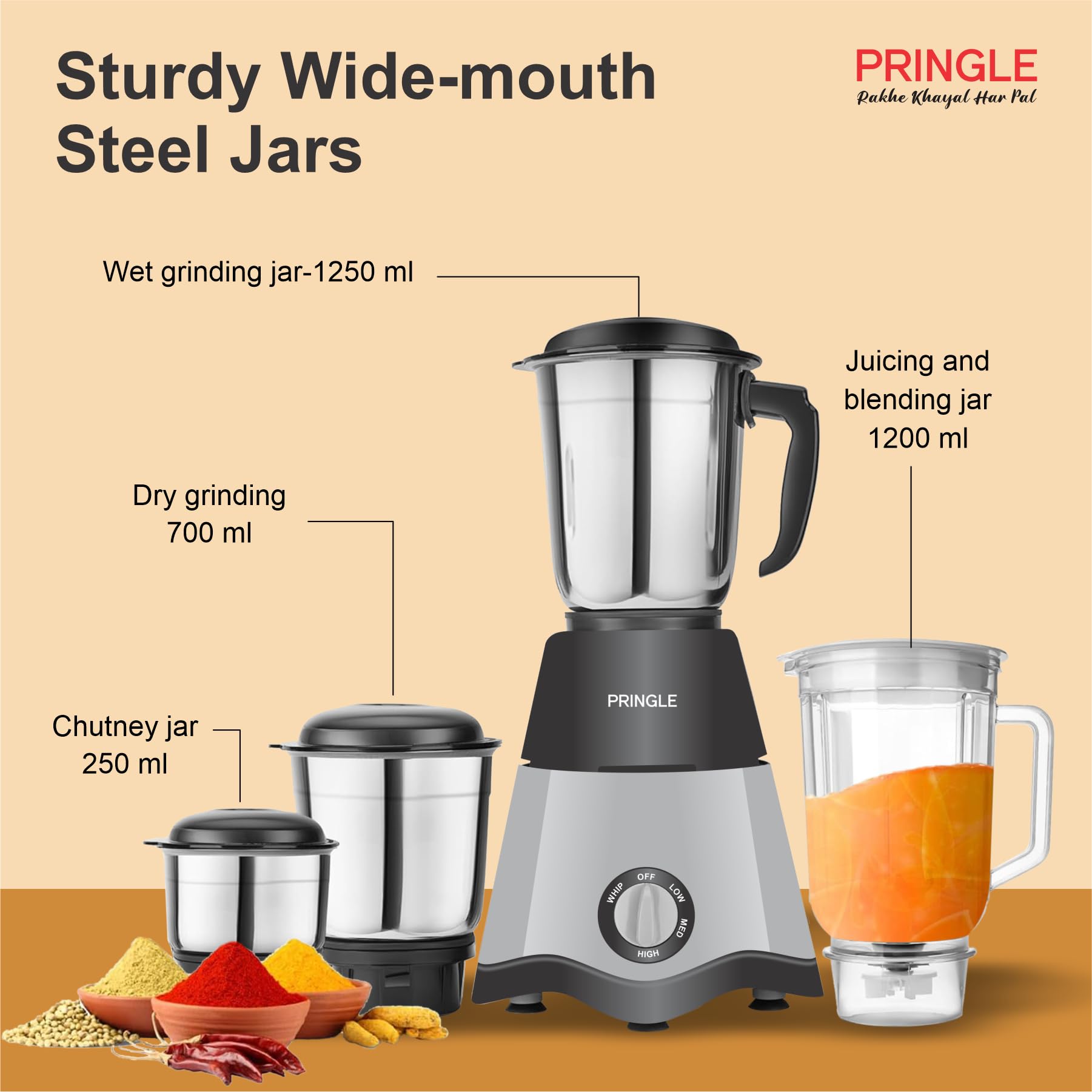 - Ergonomic Design Pringle mixer grinder is aesthetically designed high grade plastic body and the jars are made with stainless steel that ensures durability while adding elegance to your kitchen