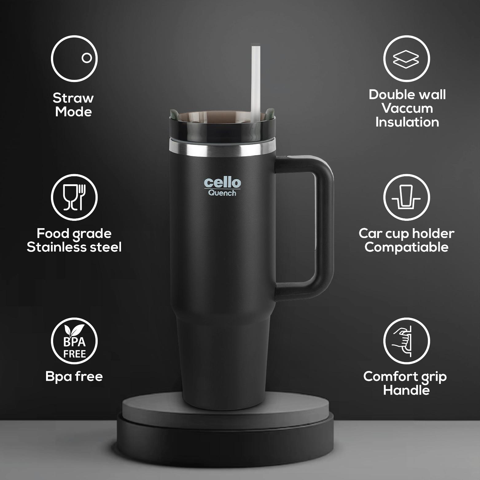 Elevate your hydration game with the Cello Quench Stainless Steel Tumbler, a perfect blend of style, functionality, and convenience. Designed for the modern, on-the-go lifestyle, this 900ml tumbler is crafted from premium food-grade 304 stainless steel, ensuring durability, rust-resistance, and no metallic aftertaste. Whether you’re sipping on a hot coffee during your morning commute or enjoying a chilled smoothie during a road trip. The tumbler features a sleek, tapered design that fits comfortably in most car cup holders, making it an essential companion for your daily journeys. Its ergonomic handle offers a comfortable grip, and an anti-splash feature ensures a worry-free drinking experience. For added convenience, the tumbler comes with a reusable straw and is dishwasher safe, so cleaning up is effortless. Perfect as a thoughtful gift or a personal treat, the Cello Quench Tumbler combines a stylish, powder-coated matte finish with practical features to enhance your daily hydration. BPA-free and made from safe, toxin-free materials, it’s ideal for coffee, tea, water, juice, and more. Embrace the ultimate in portable drinkware with the Cello Quench Stainless Steel Tumbler and enjoy your beverages just the way you like them—wherever life takes you.