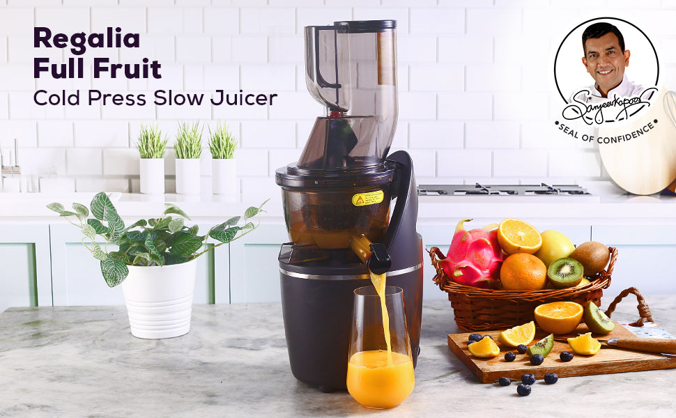 - 50% More Juice:Â Unlike the regular high-speed juicers that extract a thin watery liquid as juice while throwing away all essential nutrients, Regalia Full Fruit Cold Press Slow Juicer retains fiber in the juice. It throws out only dry, indigestible, hard fiber as residue and yields 50% more juice.