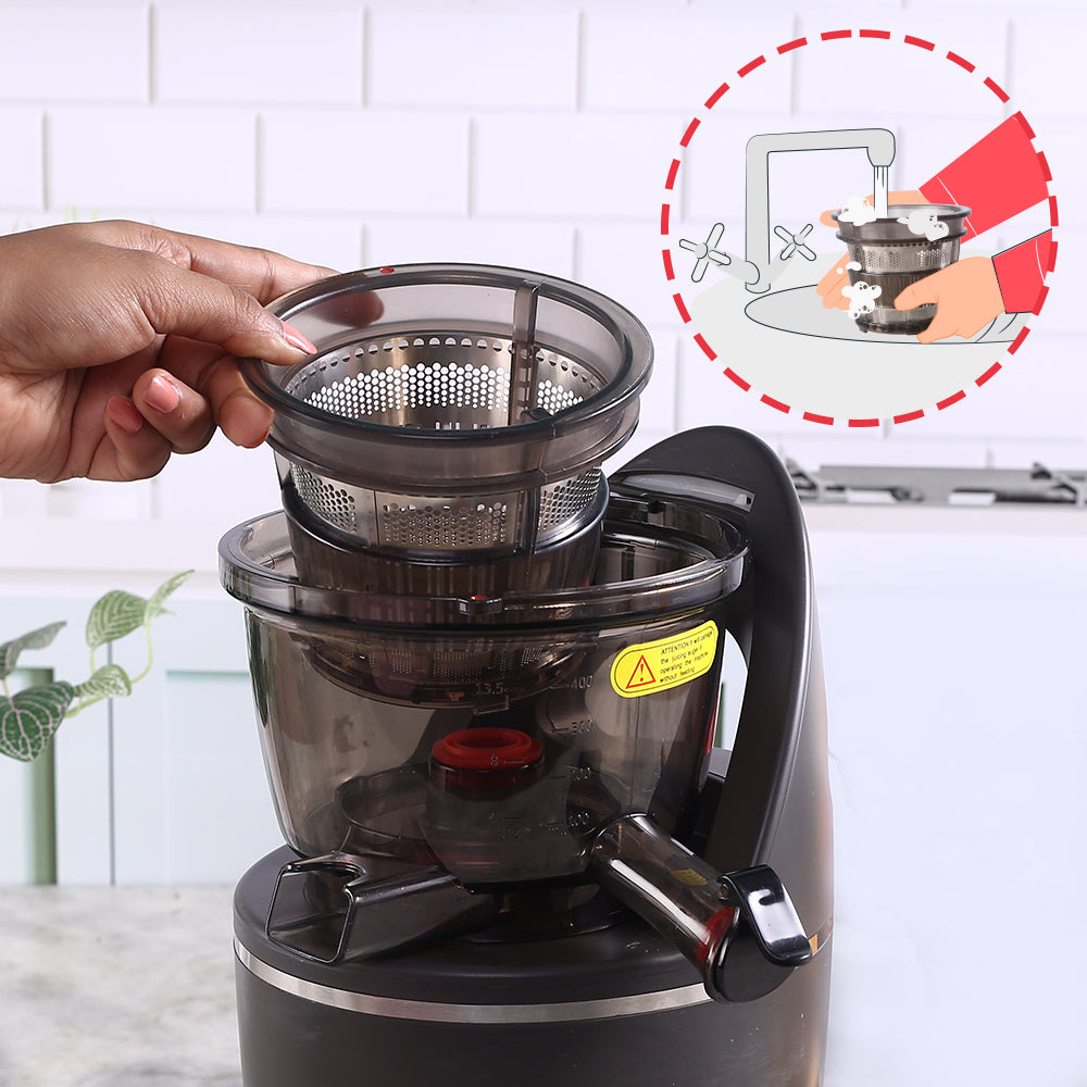 The Application has no sharp blades as it used Auger Screw, a screw-like structure for juices. So cleaning is super easy. The cleaning brush has a specially designed end that helps to remove the pulp easily in the outlet. The special Pomace cup which comes as a part of accessories collects dry waste and helps keep your juicing corner tidy.