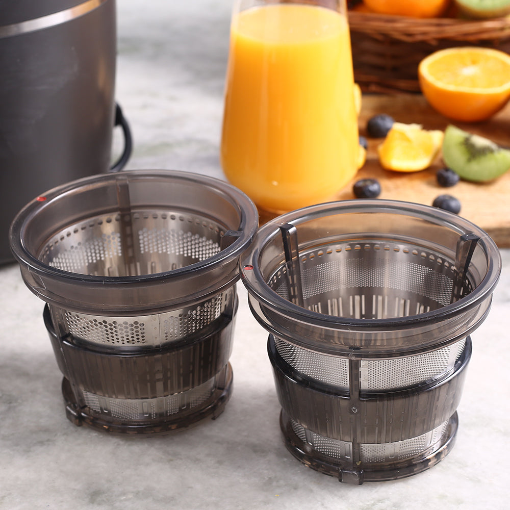 The fine and coarse strainer features a 0.3-milimeter mesh grid, which effectively filters out nearly all solid particles to create juices with a soft, velvety texture. The external and internal sizes of the fine strainer are different, which facilitates the straining process when liquid passes through the fine mesh.