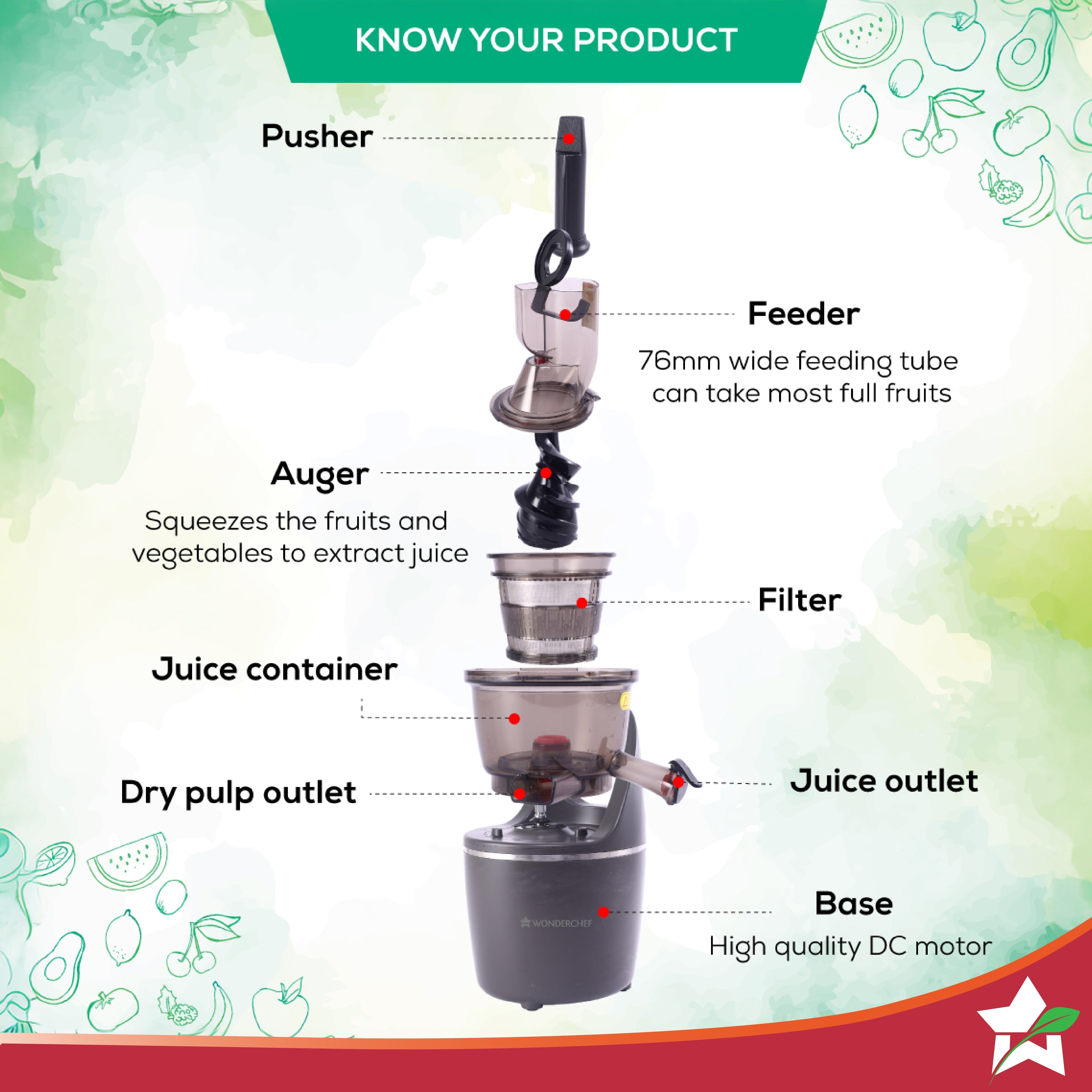 Owing to the fast-paced lifestyle today, getting recommended daily nutrition from food may get difficult. Fresh fruit juice can come to the rescue and charge you up with a nutritional boost. Regalia Full Fruit Cold Press Slow Juicer by Wonderchef packs a nutritional boost with the goodness of enzymes and vitamins. The juicer operates at 55 RPM and extracts juice with a gentle squeezing process. The slow juicing technology mimics the hand-squeezing motion for juicing to guarantee the retention of all essential nutrients, otherwise lost in regular juicers.