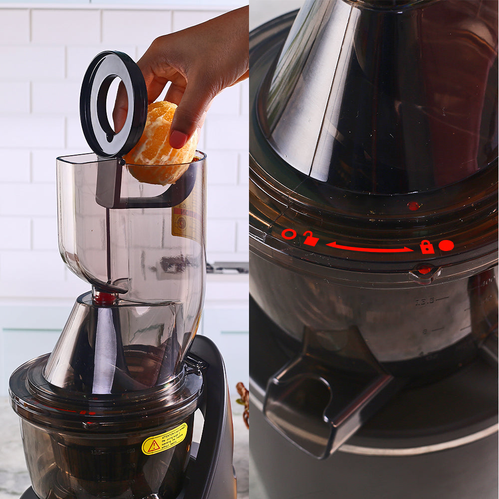 Fruits and other ingredients can be inserted without cutting due to the wide tube with 76 dia. Helps to save preparation time and loss of nutrition. The tube also has a safety lock so small children cannot open and insert their hands in the juicer. A specially designed pusher helps you navigate the ingredient conveniently.