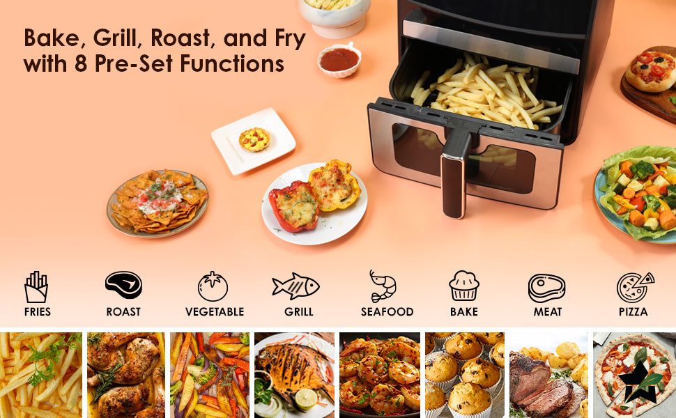 - 8 Pre-set Functions: These options allow you to bake, grill, roast, fry your favourite snacks and appetizers like French fries, sweet potato fries, tikkas, roast chicken, grilled vegetables, doughnuts, muffins and much more, with just a single touch.