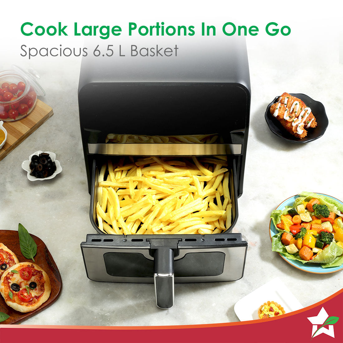 - Capacity: With a spacious 6.5L cooking basket, this air fryer is perfect for large family gatherings, accommodating a variety of dishes for everyone to enjoy.