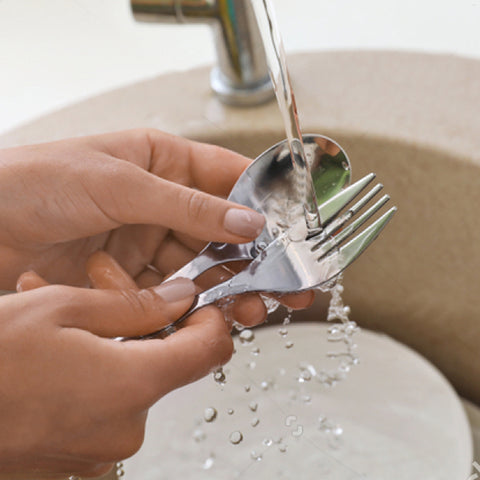 The best way to treat you cutlery is hand washing. Always use mild detergents and soft sponge to clean. Avoid using abrasive cleaners or steel wool, scrubbing pads and bleach detergents. Wash your cutlery as soon as possible and do not leave cutlery to soak or drain in dishwasher / sink for long time. After washing, dry with a soft cloth. Avoid a direct contact of stainless steel cutlery with aluminium as it releases chlorine, which can lead to discoloration of stainless steel.