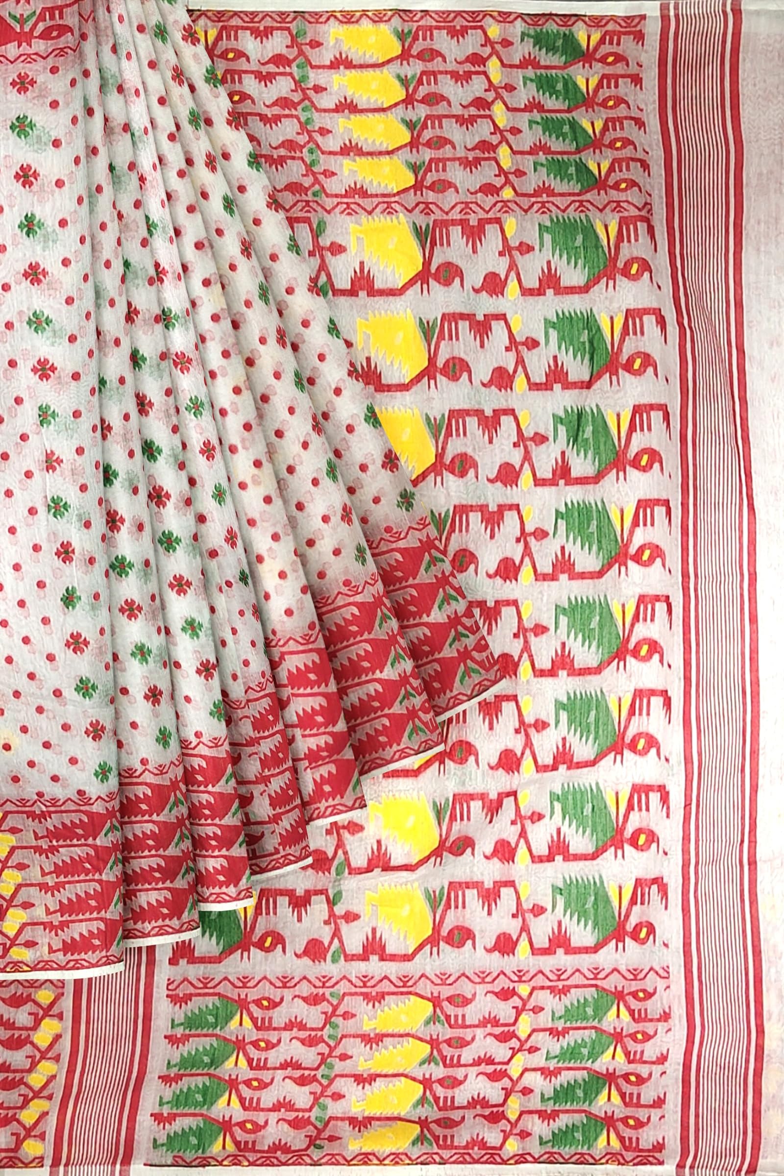 - Authentic Jamdani Saree: A traditional, handwoven cotton-silk saree featuring the intricate Jamdani weave.