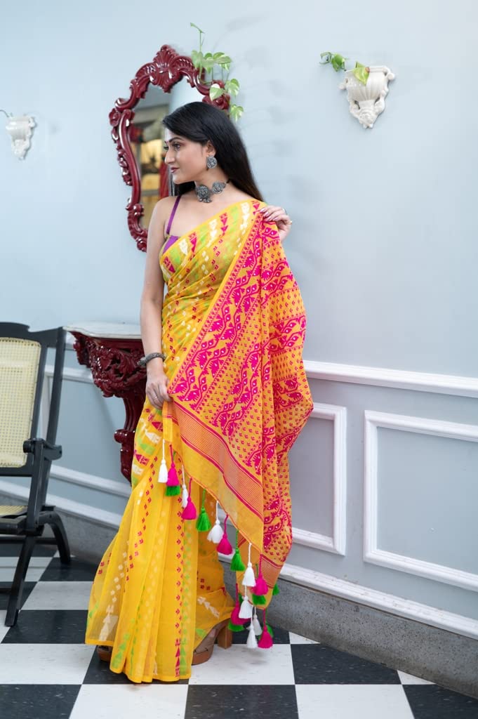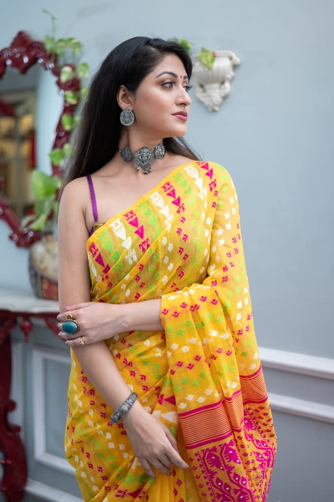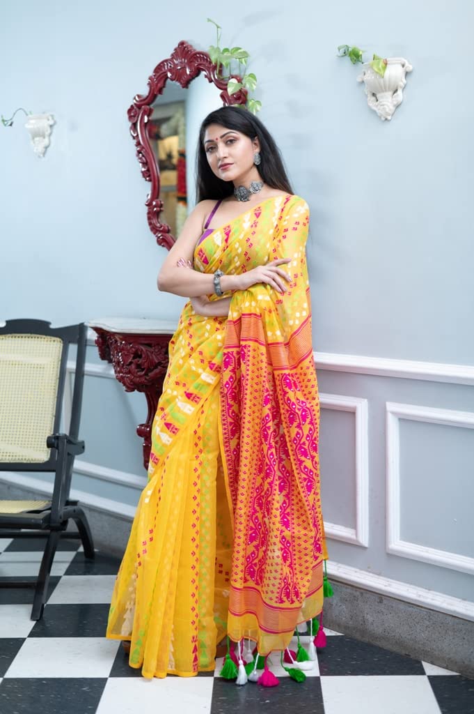 - This beautiful Soft Dhakai Jamdani Saree is made form Cotton is very comfortable to wear. Soft and shinning in nature, the weight of the saree is very light and it feels relaxed when worn.