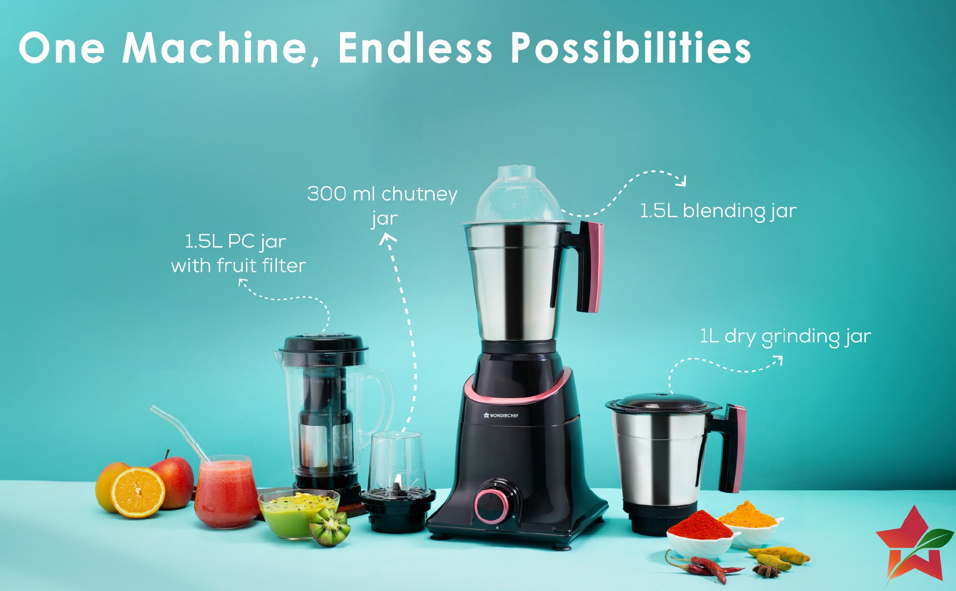 Jars for Multiple Tasks: 1.5L blending jar, 1.5L PC jar with fruit filter, 1L dry grinding jar, 300 ml chutney and spice grinding jar – from turmeric to batters, grind tough ingredients with ease.