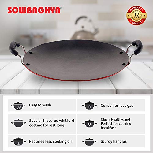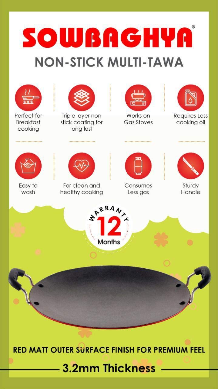 Details: SOWBAGHYA Non Stick Concave Multi Tawa is MADE OF PFOA Free Nonstick Which is safer compared to ordinary non stick. This non-stick is safe for making /food contacts. One can make tawa fry vegetables , Uttapam, Pan cake paratha , Naan’s & Various types of rotis on this tawa with Lesser Oil and without the need to worry about food sticking on the tawa. This will be your best companion for making lovely pancakes, dosa, uttapams etc specially when you cook all of these on a gas stove. This tawa is flat at the base ,thereby giving a good stability to the tawa when kept on the gas stove. Moreover, the tawa has a thickness of 3.2 MM that heats up quickly and the flat surface compliments it for distributing heat evenly. Our Tawa makes the perfect gift for friends and family members with a passion for cooking. It would be a gift that will stay with them through the years and will remind them of your love and appreciation. This base also reduces the chances of overcooking and enables you to efficiently cook on low or medium heat, without wasting gas or electricity. It also ensures non-stick cooking which makes it perfect for any dish with less oil. It flaunts a classy design and will look absolutely stunning in your kitchen.