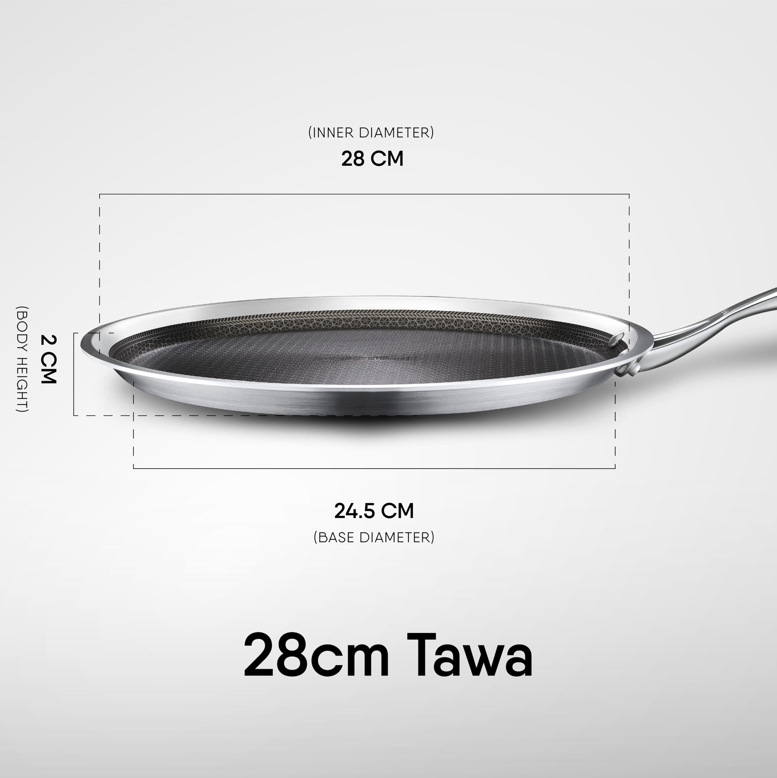 Details: The Stahl Artisan Hybrid Tawa is the best dosa tawa because of its stick resistant technology, chip-proof coating and less oil consumption. HexaRidge Technology: This tawa has a German technology Greblon coating which is embedded in a honeycomb structure. The ridges of the honeycomb structure are elevated so that there is no contact of the spatula on the stick resistant tawa, giving it five times the life of any other coated tawa on the market. You can use a metal spatula on it, or even a knife! The Stahl Artisan Hybrid Tawa, is made of triply technology. This tava can be used on an induction base as well as a stove top. It is manufactured with utmost care and precision, ensuring an impeccable feel and finish, with great utility and heat efficiency. Great to Make : Dosas, Chillas, Crepes, Pancakes, Parathas, Omelets.