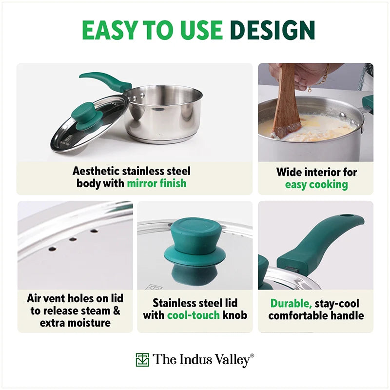 - 😄EFFORTLESS COOKING GUARANTEED: Aesthetically designed body with mirror finish, this stainless steel tea pan is very convenient for everyday use. The stainless steel saucepan has beautiful, cool-touch green Bakelite handle that give you a comfortable grip.