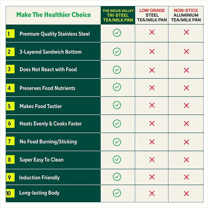 - 💪100% FOOD SAFE: The Indus Valley’s Premium Stainless Steel Tea pan/ Milk pan/ Saucepan with Tri-ply Sandwich Bottom is 100% food-safe; with no chemical coating.
