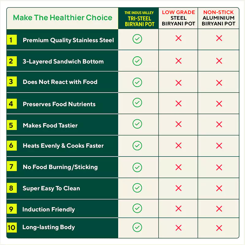 - 💪100% FOOD SAFE: The Indus Valley’s Premium Stainless Steel Stockpot/ Biriyani Pot/ Rice Cooking Pot/ Stockpot/ Stewpot, with Tri-ply Sandwich Bottom is 100% food-safe; with no chemical coating.