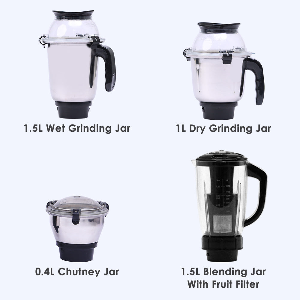 Sumo Black DLX has 4 different jars to cater to all your grinding – blending needs. Use the wet grinding jar to make delicious smoothies, milkshakes and idli – dosa batters. Grind garam masalas in the dry grinding jar and you can use the chutney jar for making all types of chutneys and wet gravy masalas. Make fresh fruit juices every day in the blending jar that comes with fruit filter, so you can enjoy your juice without the fruit pulp.