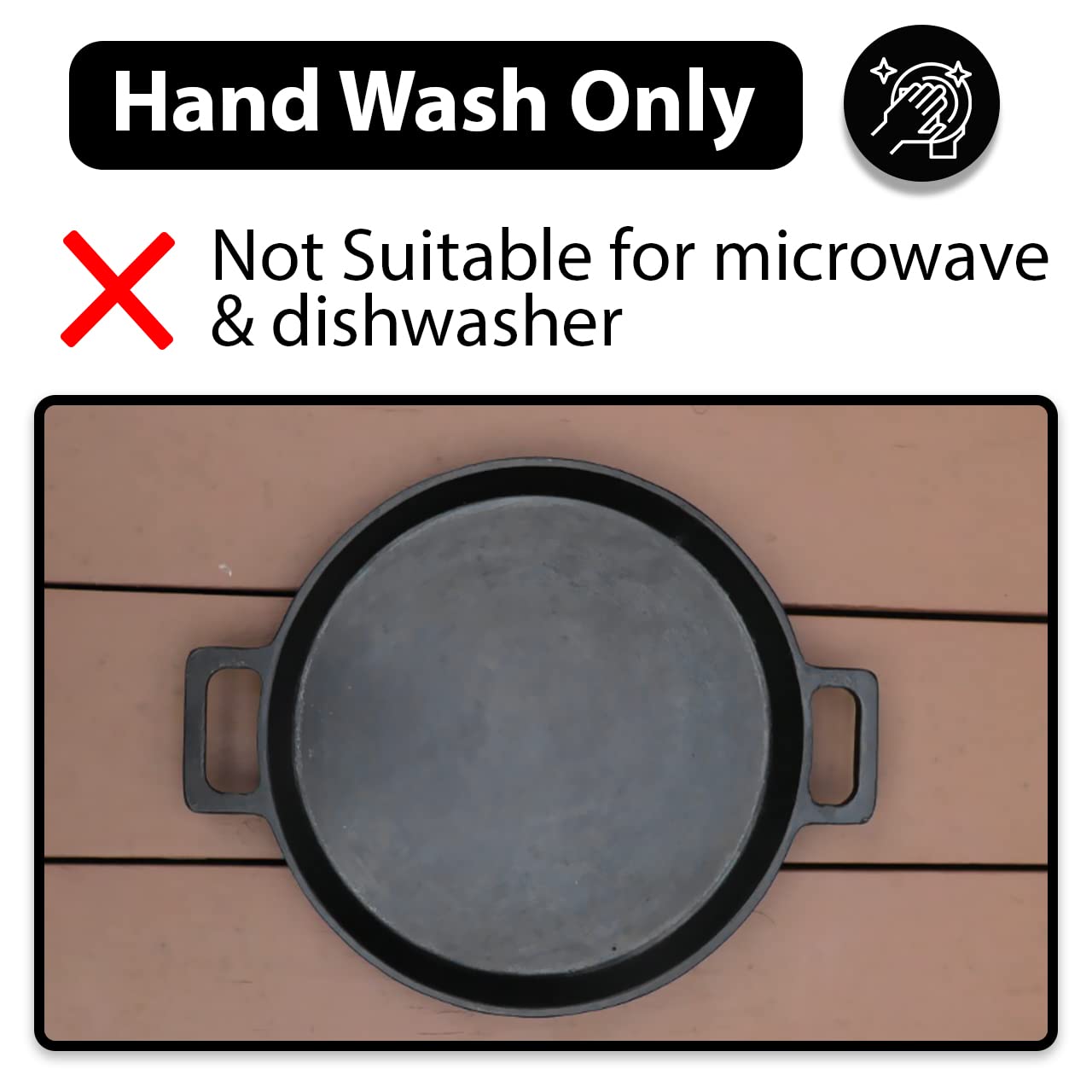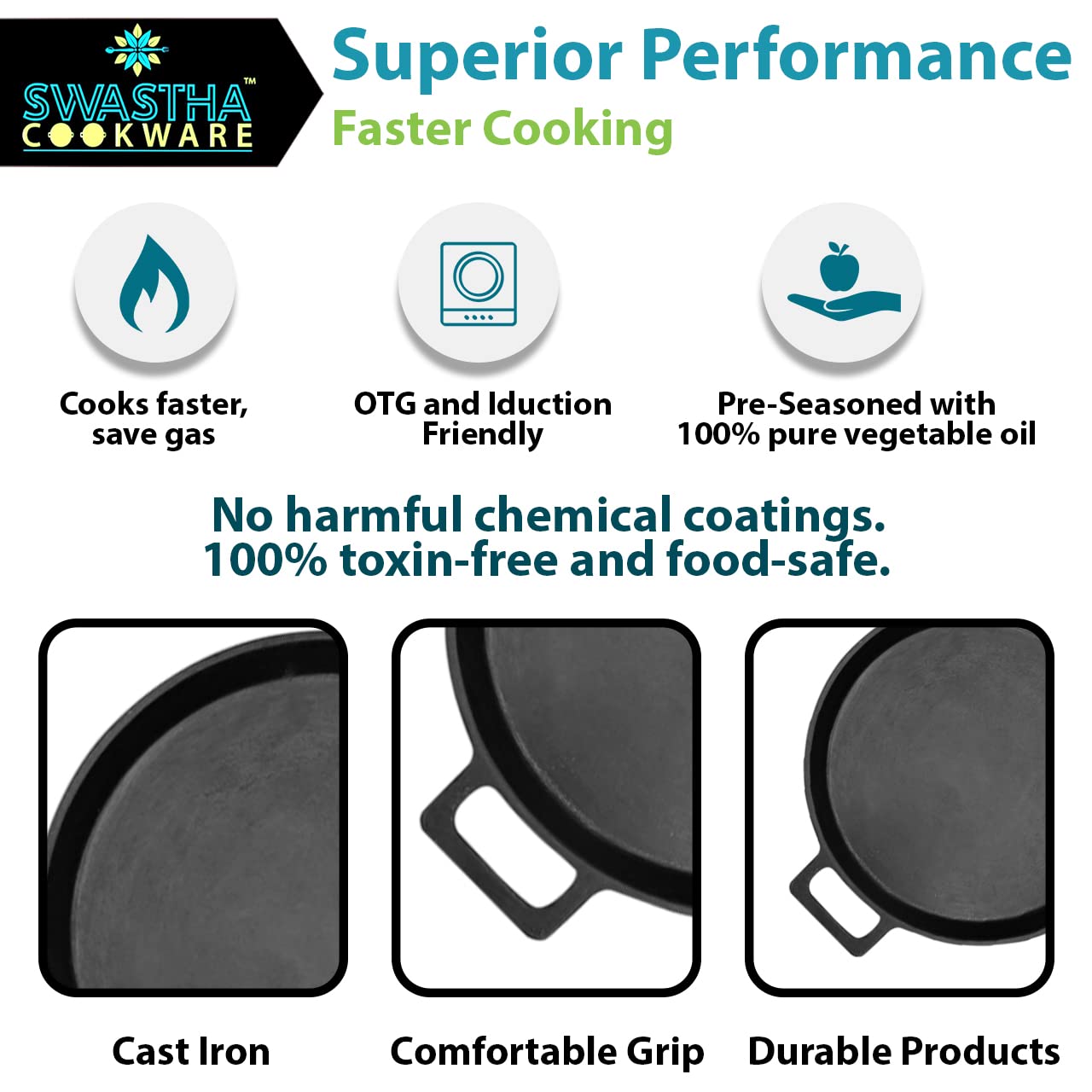 Details: Swastha Cookware Cast Neer Dosa Tawa helps you make excellent and crispy dosa. Browns your food beautifully. Not spoilt by heat, heats faster and evenly cooks food. You can use metal spatulas. This product is pre-seasoned with 100% pure vegetable oil and free from chemical coating. It adds iron content to your meals that helps fight iron deficiency. A healthy cookware indeed. After using apply a thin coat of oil on the cookware. Keep away from moisture. Transfer the food after cooked in cast iron cookware to another container immediately after cooking. Swastha 12.5” Neer Dosa Tawa is a multi-purpose tawa that can be used for making Dosa, Chapati, Paratha etc.