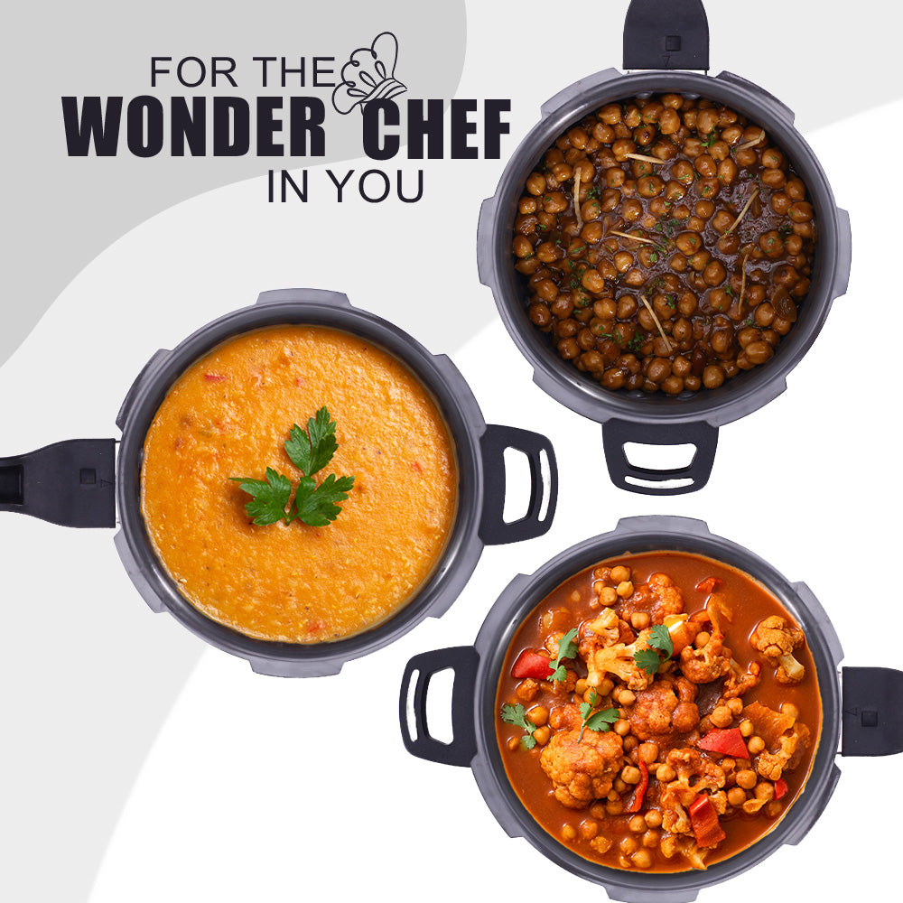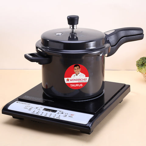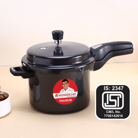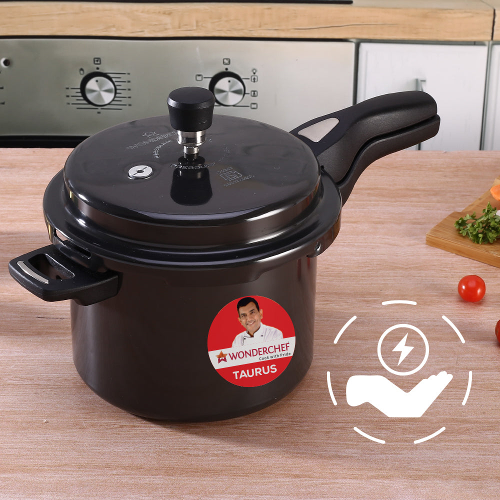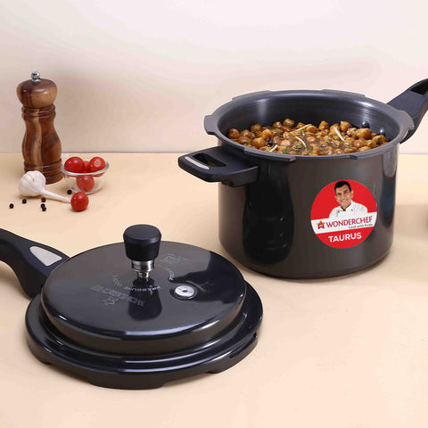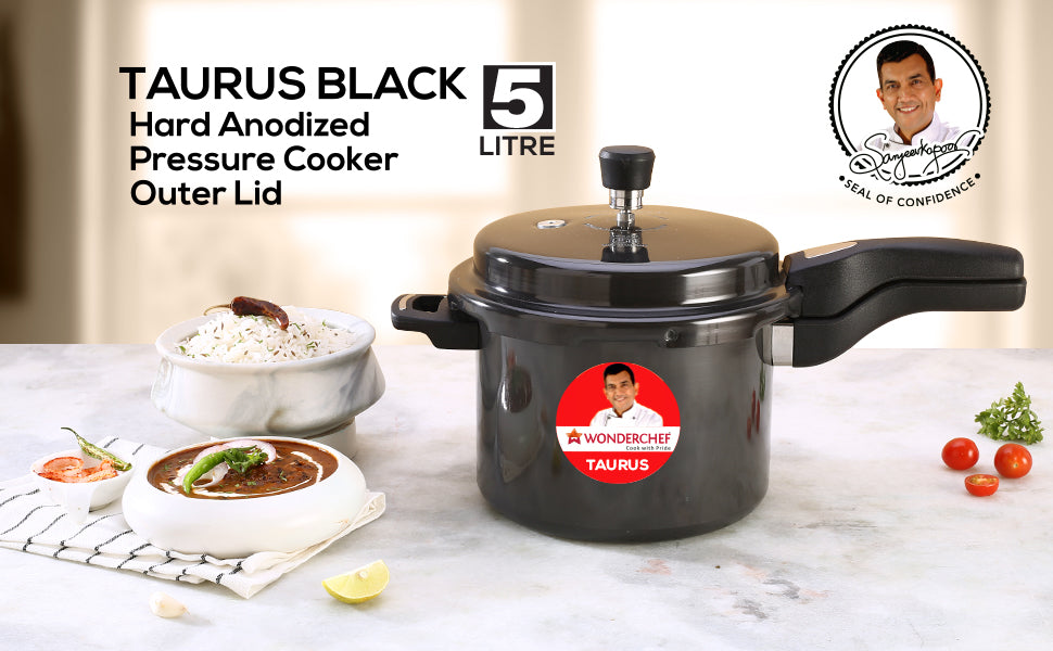 - Make idli, biryani, pulao, curry, dal, soup, rice, steamed dishes, cake and much more with Wonderchef Taurus Black Hard Anodized Pressure Cooker – the perfect solution for your daily cooking.