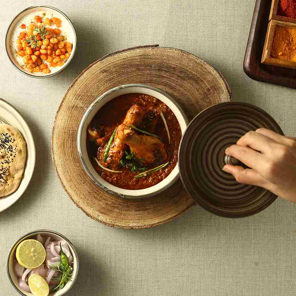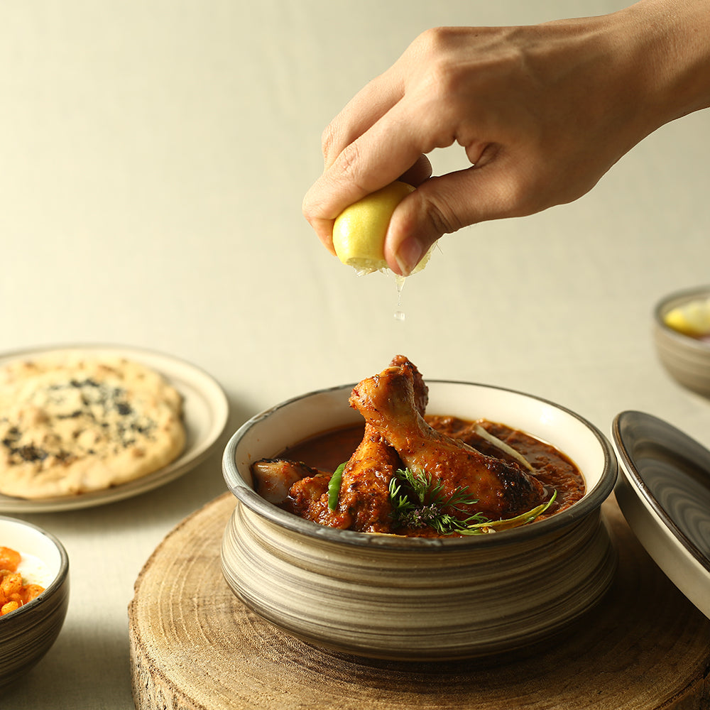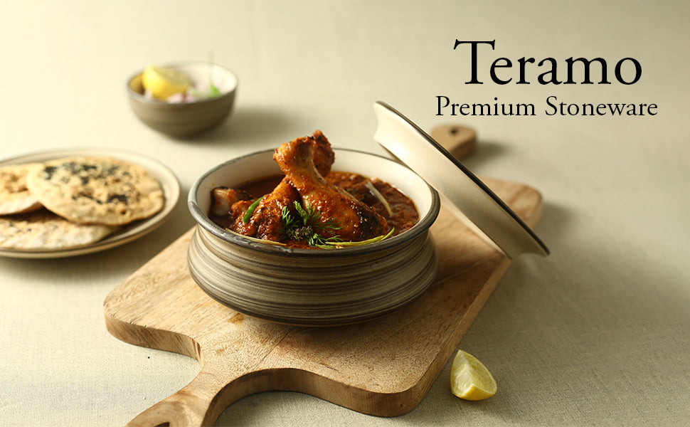 Inspired by the earth tones merging in the sky, resembling the landscape of the beautiful valley city of Italy, Teramo. We present Teramo premium stone-ware collection, a true blend of traditional craft with contemporary forms. Serve a curry or aromatic biryani in the muddy brown handi and get ready for compliments!