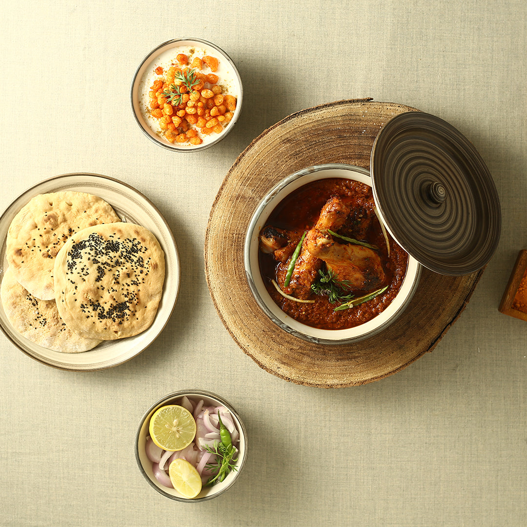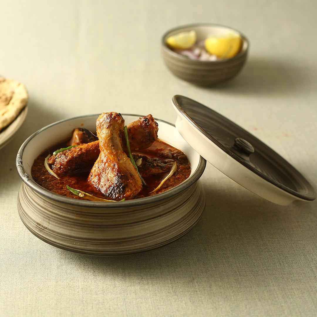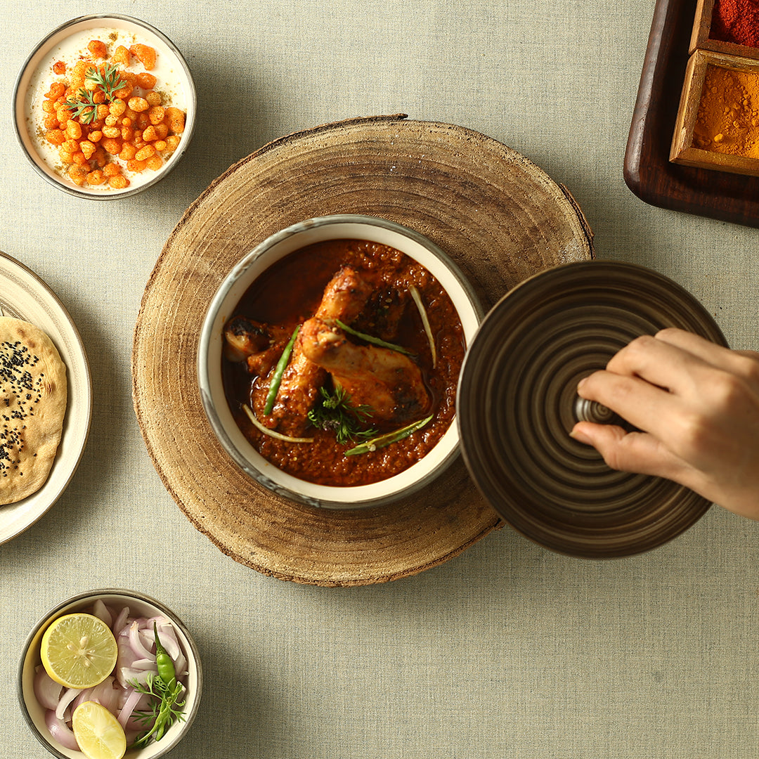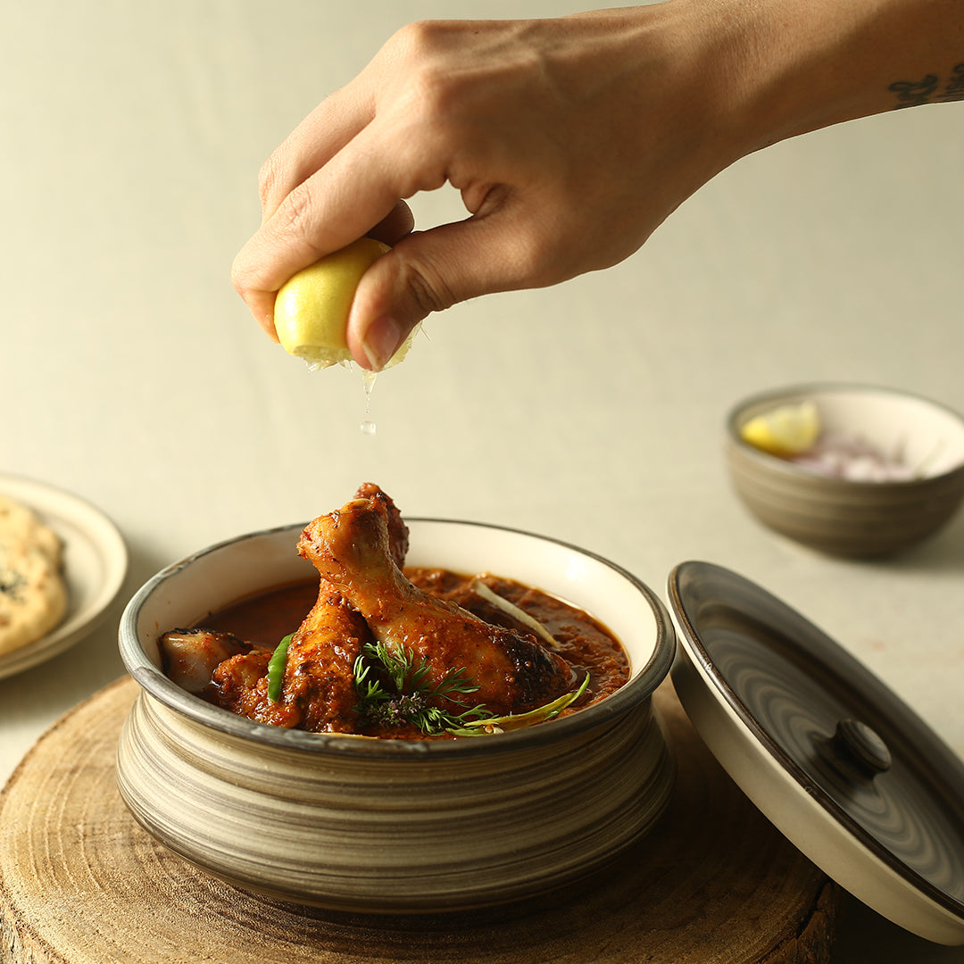 Serve your richly flavoured curry or an aromatic biryani in this earthy muddy brown handi and get ready for compliments! The small sized handi is perfect for serving two people. Pair it with Teramo plates and bowls of the same collection and add a rustic vibe to your dinner table.
