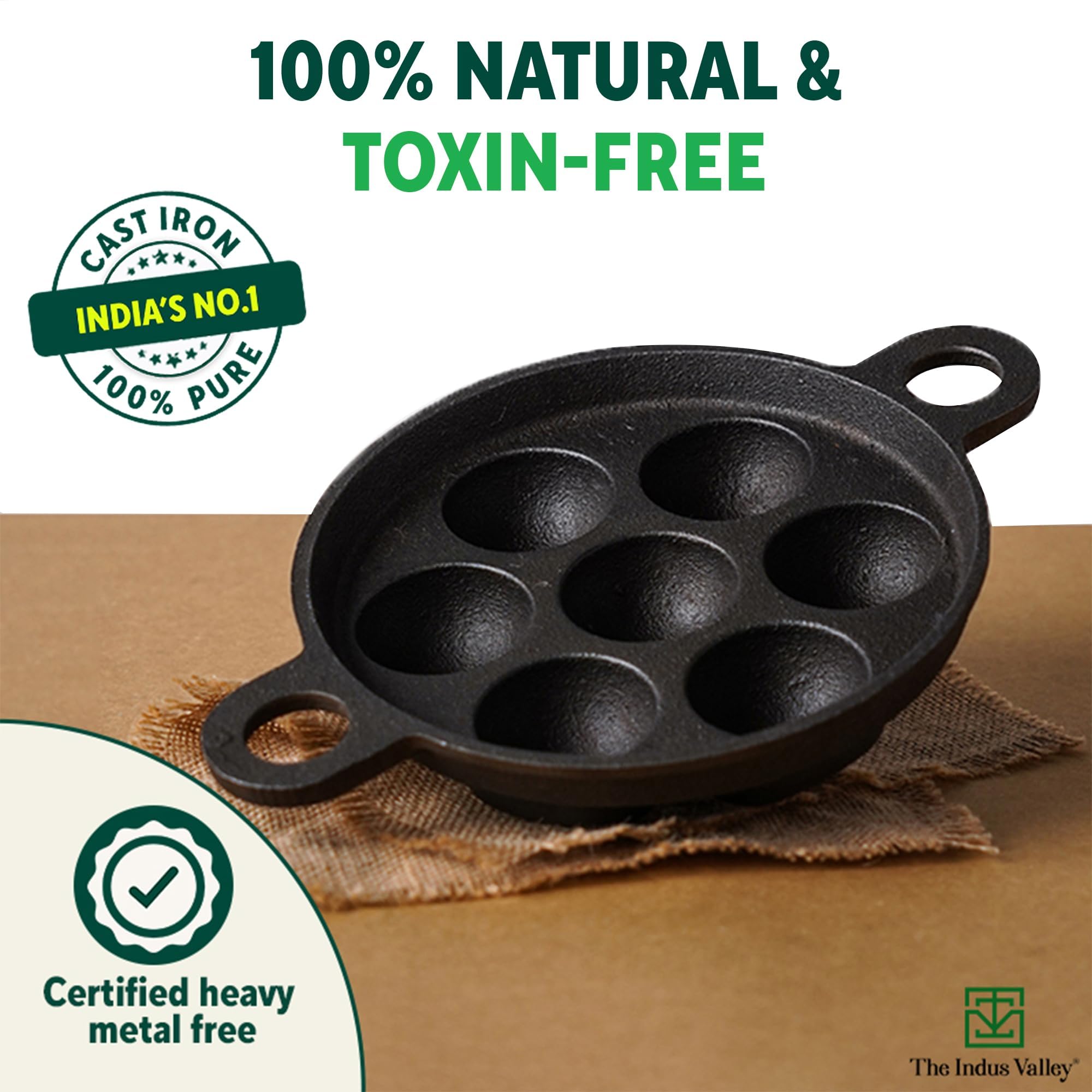 - 🌿 Toxin free cookware: Made from 100% Natural cast iron cookware, this cast iron paniyaram pan is a 100% Healthy cookware, food safe without chemicals, coatings or toxins