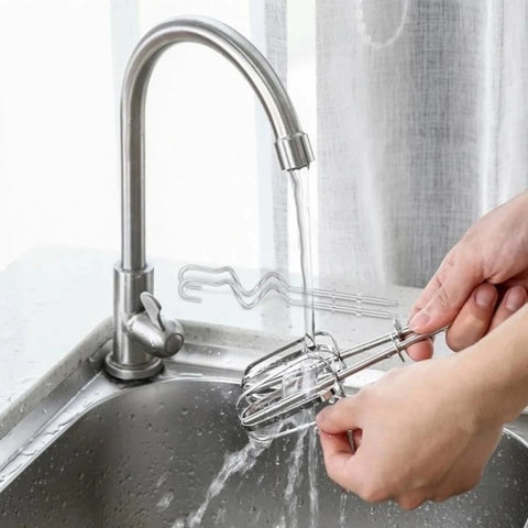 To clean, remove the attachments and rinse them with regular water and soap. Do not wash the mixer under running water.