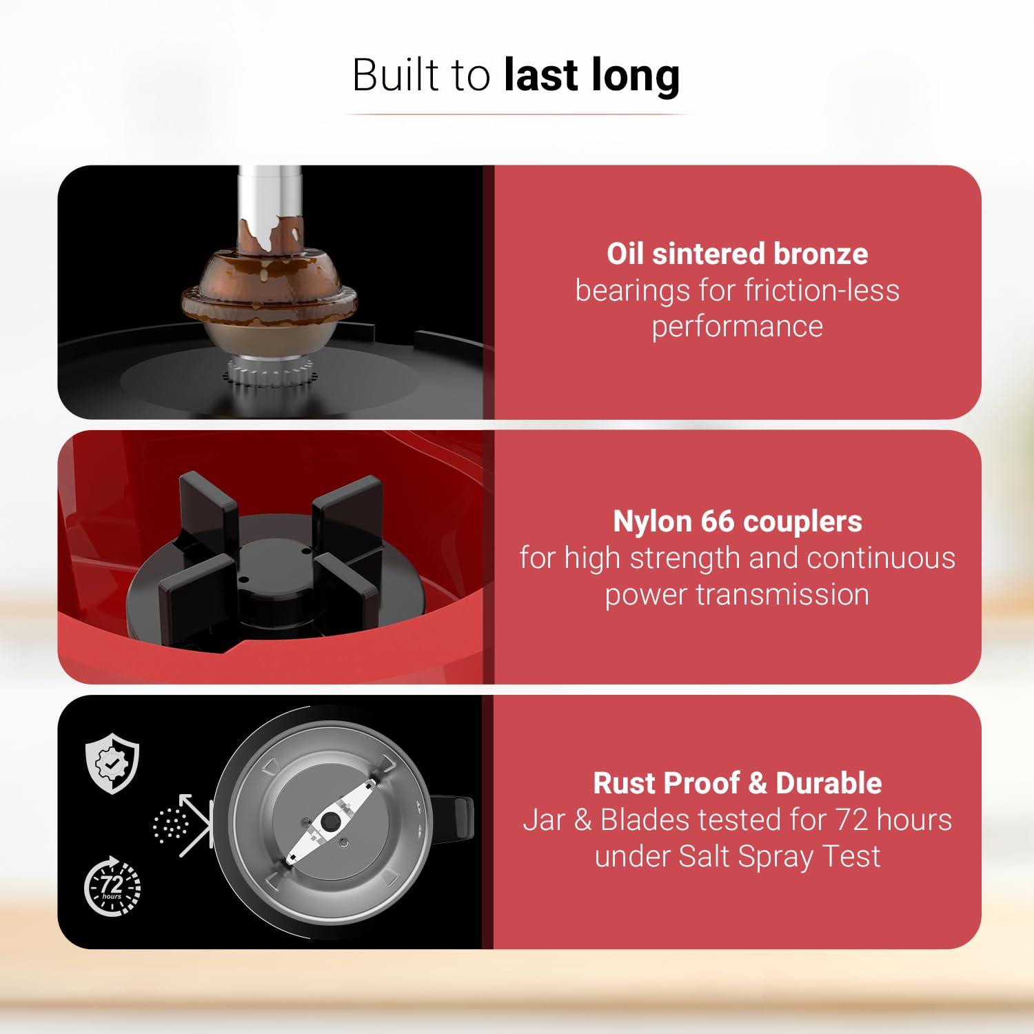 - TESTED FOR DURABILITY: The motor undergoes rigorous endurance tests, including a 30 minute grinding test, to ensure its durability and longevity. This ensures that it can handle the toughest masalas and chutneys without overheating, making it perfect for Indian cooking.