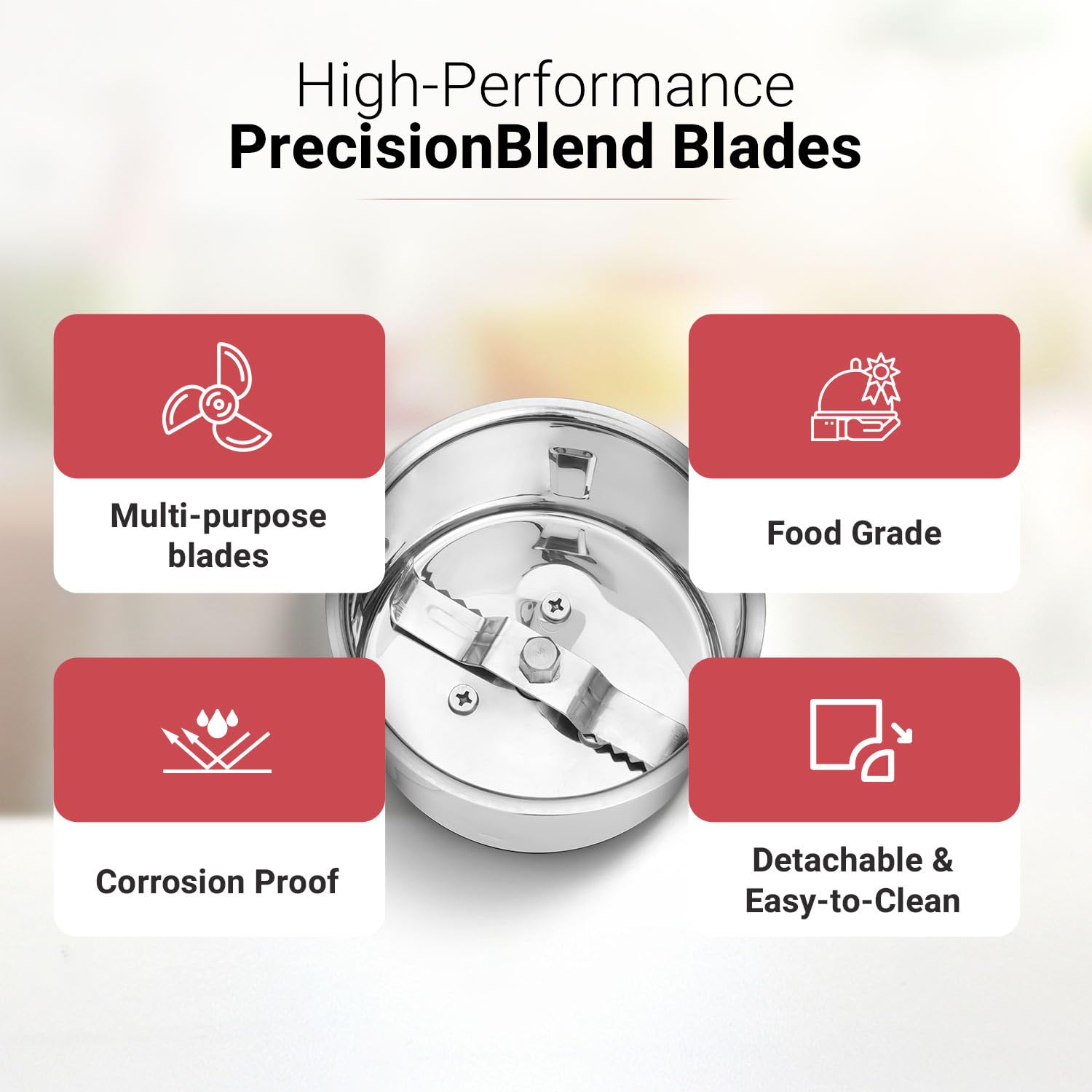 - DURABLE & SHARP PRECISIONBLEND BLADES: The high-quality PrecisionBlend stainless steel blades of the mixer grinder are designed to last long and stay sharp, ensuring consistent and efficient grinding of spices, lentils, chicken etc. Enjoy perfectly ground ingredients every time you cook.