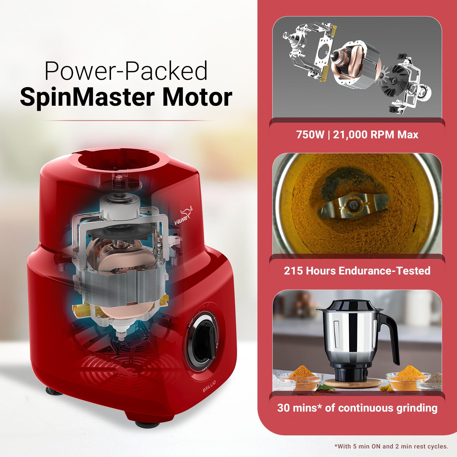 - POWER-PACKED SPINMASTER MOTOR: The V-Guard Brillio Mixer Grinder boasts a 750 watt motor that has a speed of 21,000 RPM, ensuring quick and efficient grinding of various ingredients, making your cooking faster and more convenient.