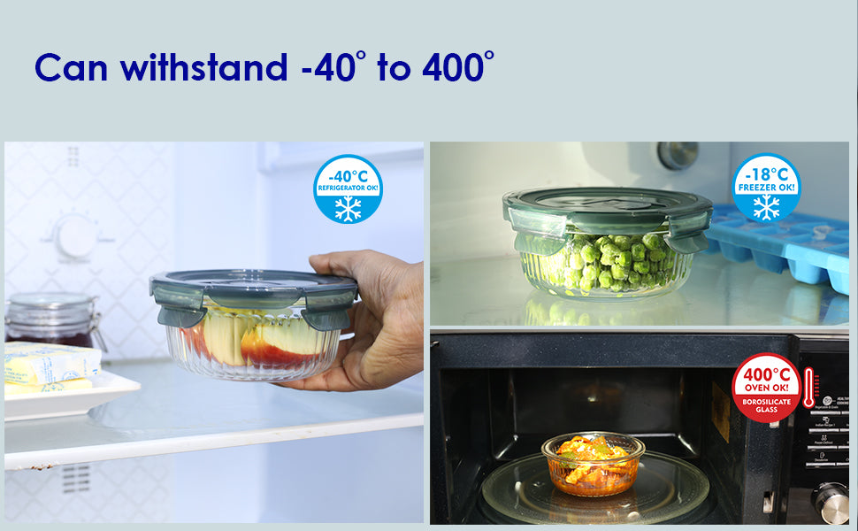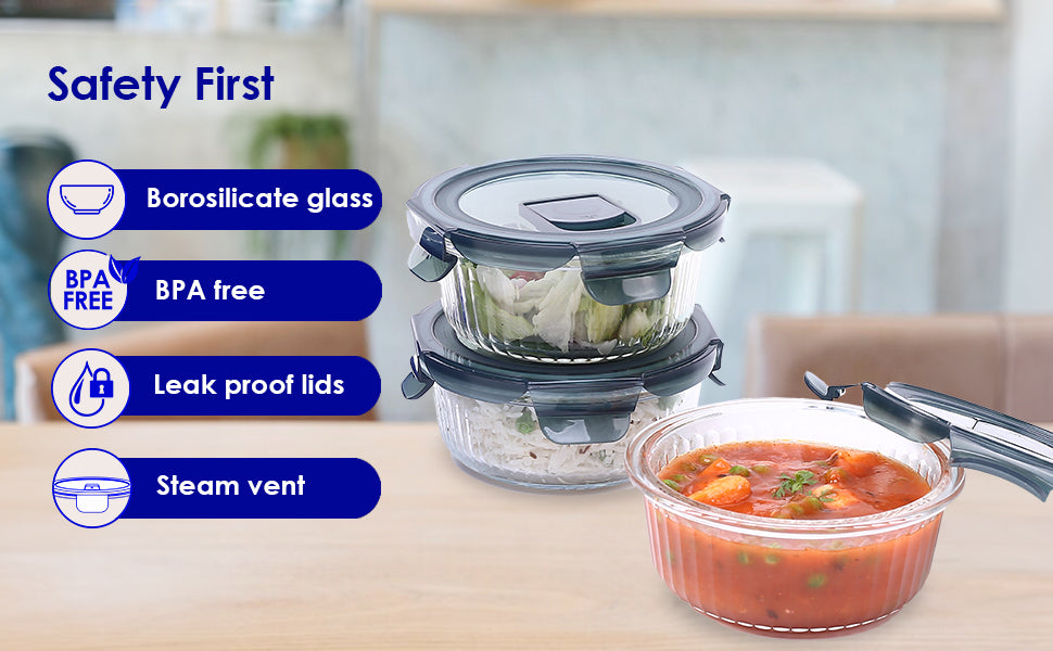 - Safety First: The lunch box includes 3 high quality borosilicate glass containers that are 100% food safe and do not release any chemicals that react with food even at high temperatures, making it suitable for oven, microwave or reheating.Â