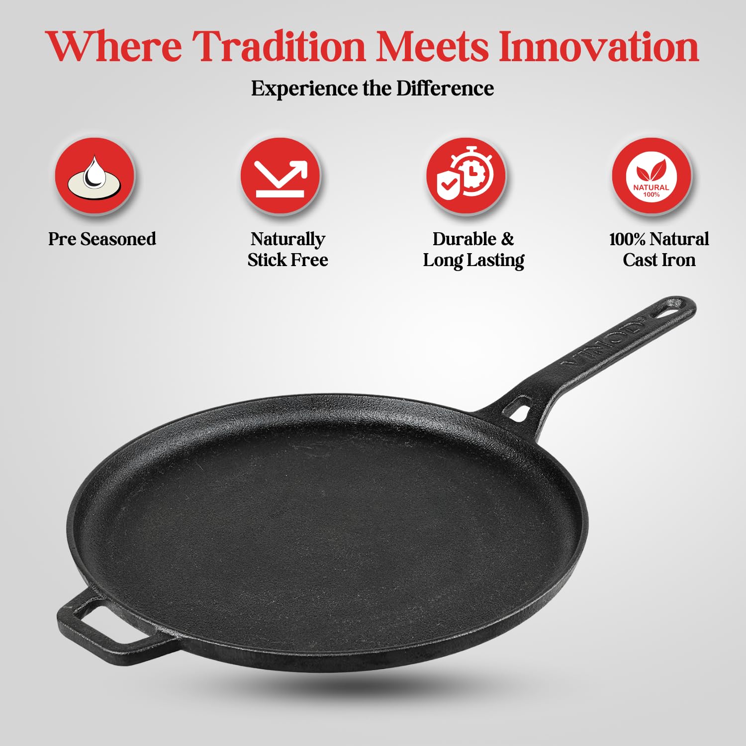 - 𝐄𝐕𝐄𝐍 𝐇𝐄𝐀𝐓 𝐃𝐈𝐒𝐓𝐑𝐈𝐁𝐔𝐓𝐈𝐎𝐍: Cast iron ensures even heat distribution throughout the tawa, cooking dosas evenly every time.