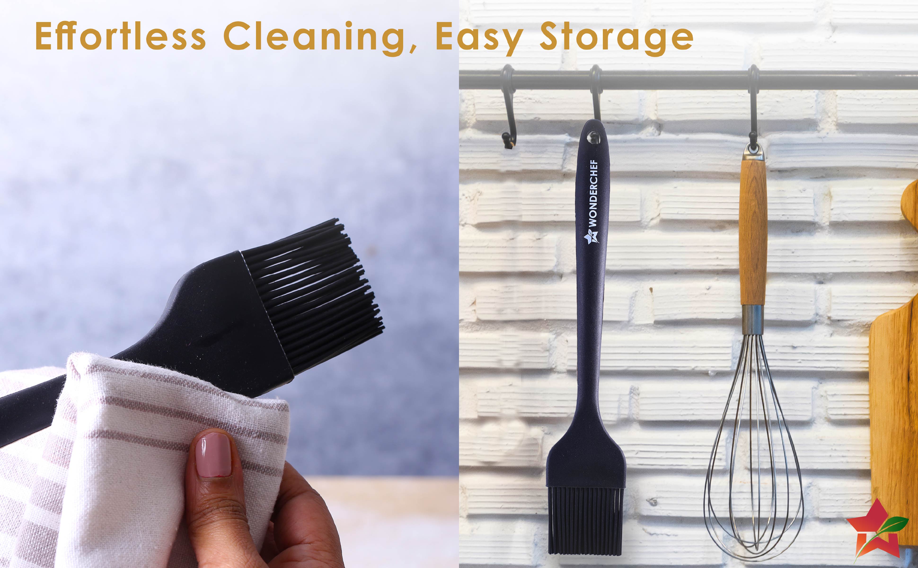 - Space Saving Design: The brush comes with a hole on the handle, thus allowing you to just hang it on the kitchen wall, saving drawer/shelf space.