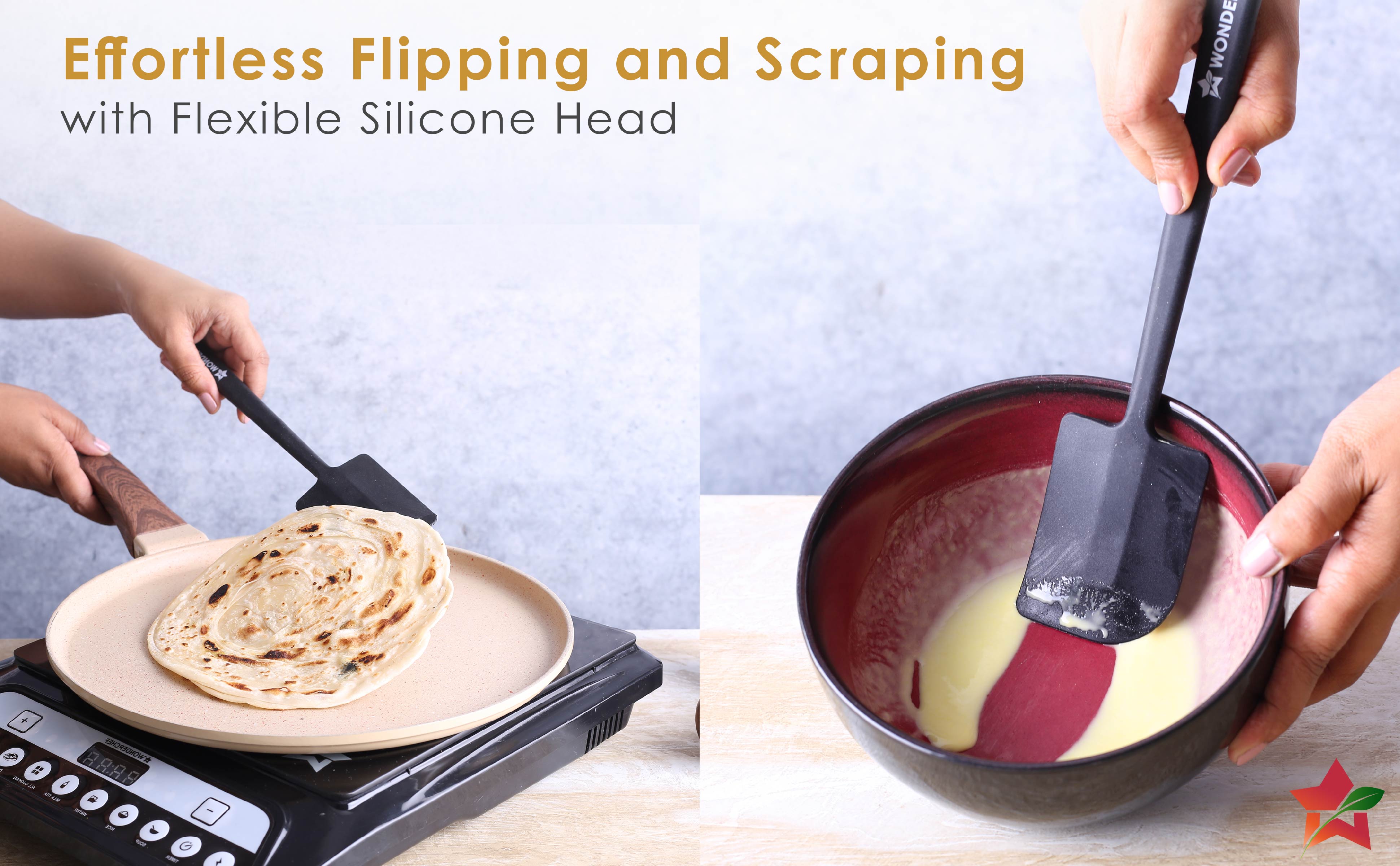 - Unique Angle for Scrapping: The spatula features a unique angle that effectively scrapes food neatly from any cookware, preventing wastage and providing precise control.