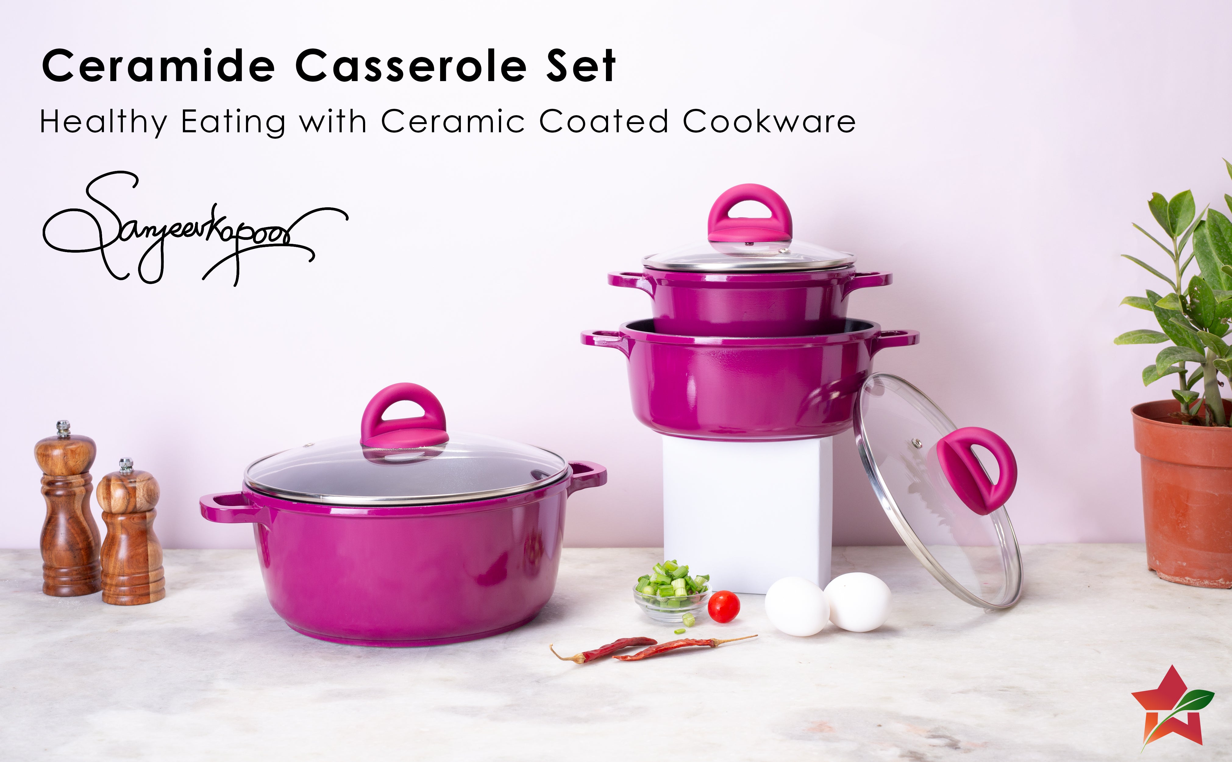 - Made from pure grade die-cast aluminium, the Ceramide Cookware Set is your go-to cookware as it is cook and serve, maintains its beauty for years and is a talking point on your dining table.