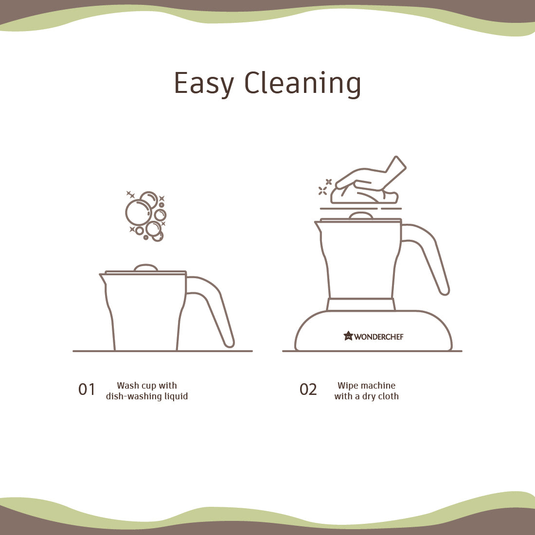 - No electronic parts in the cup. Easy to wash and maintain. The base contains heating element and induction motor