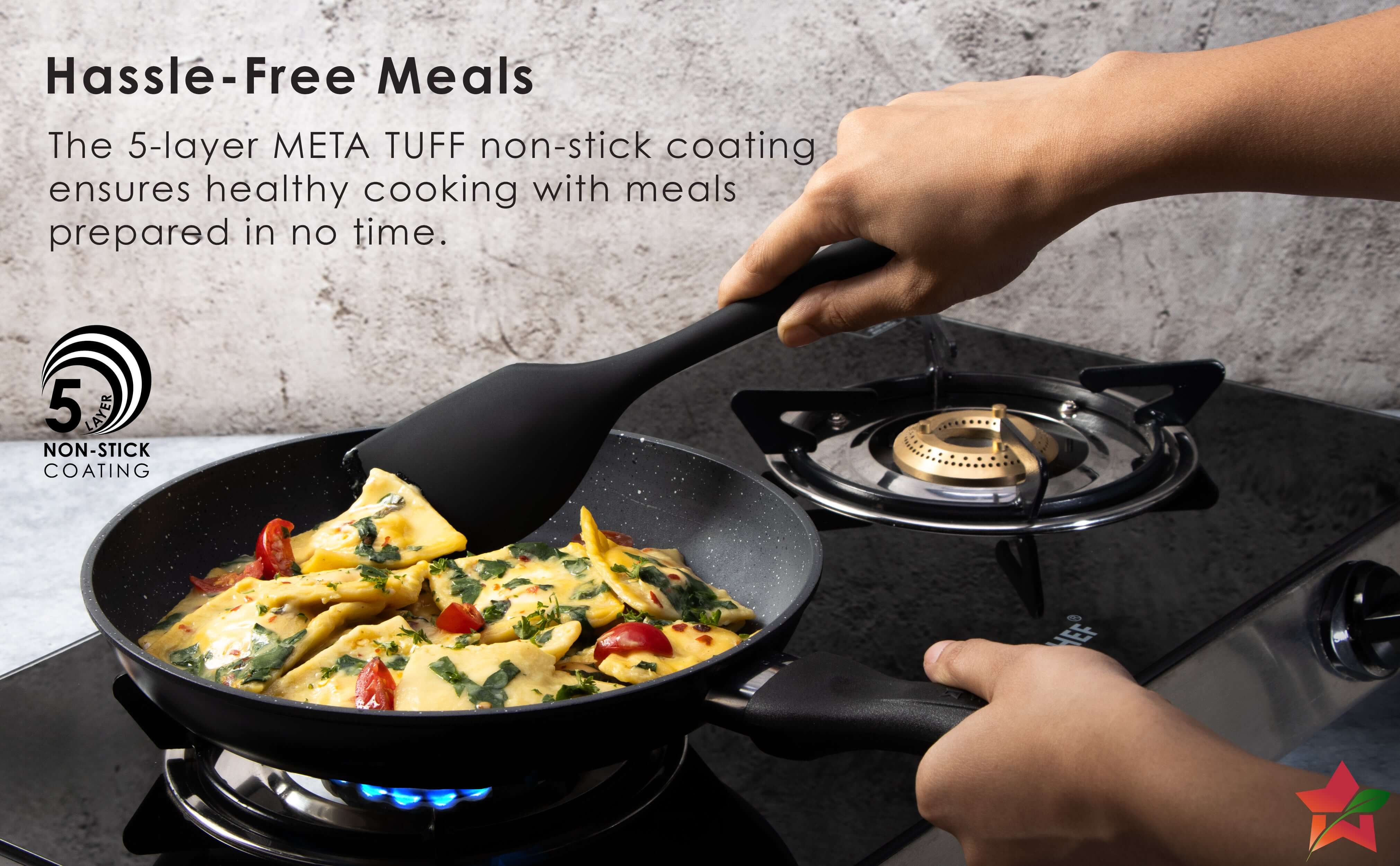 - Easy to Clean: The Meta Tuff non-stick coating repels any extra oil, thus making it easy to clean and maintain. Just wipe with soft cloth. Do not use steel wool.