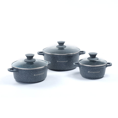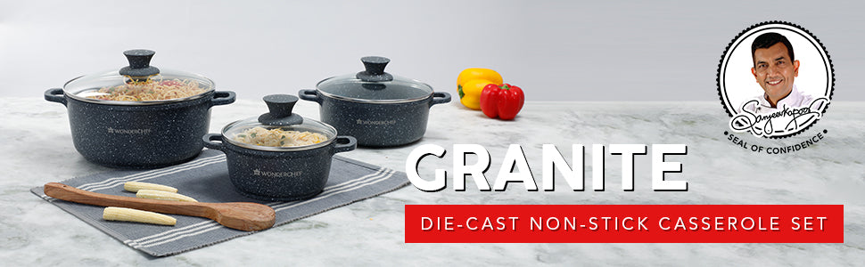 Enhance your cooking and dining experience with the most popular Wonderchef Granite Casserole Set. The granite finish gives the aluminium cookware a stylish and modern look. The granite finish gives these die-cast aluminium casseroles a stylish and modern look.