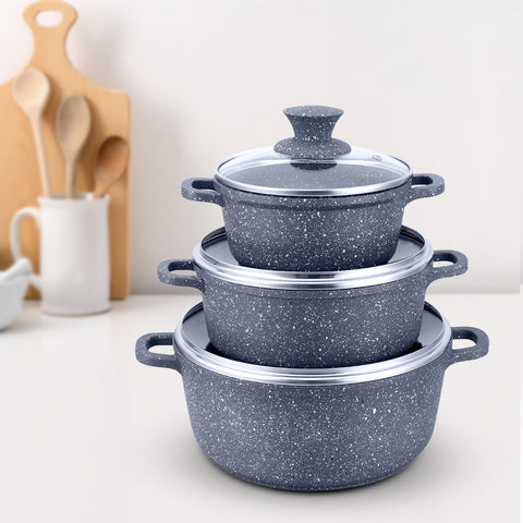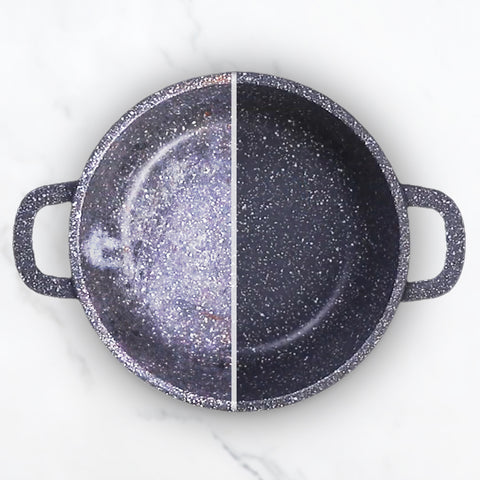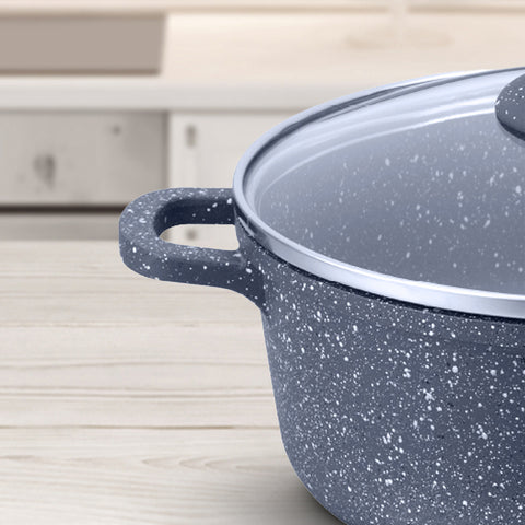 The granite finish gives the aluminium cookware a stylish and modern look. They make the food look even better. The soft touch knob of the glass lid makes it easy to hold and lift the lid.
