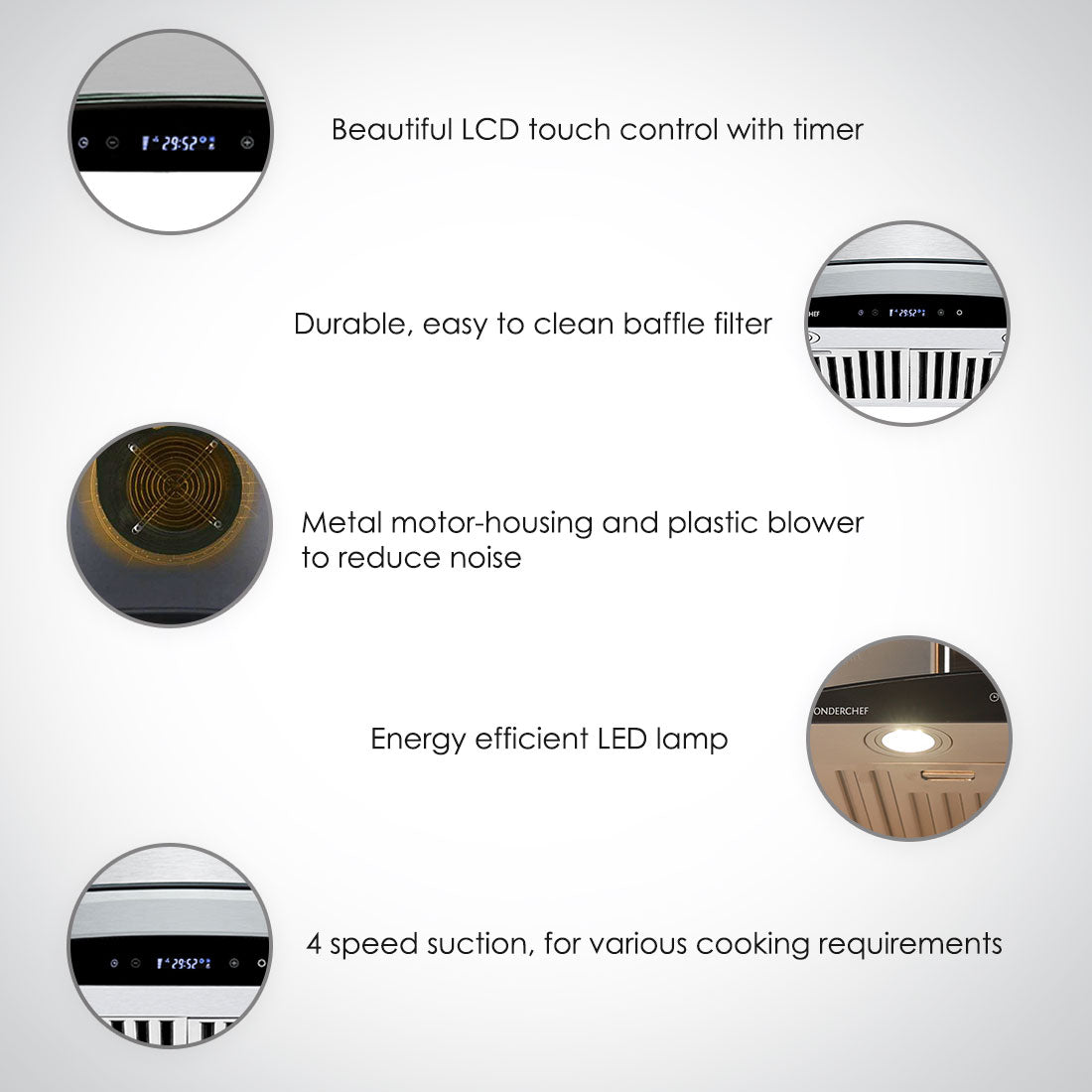 - 4 speeds – different suction capacity, as per cooking requirement (deep frying, regular cooking, etc.)