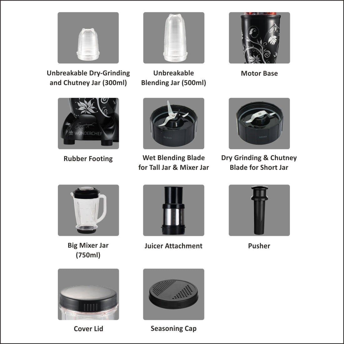 Big mixer jar 750ml with lid(1 unit), tall jar 500ml with blending blade(1 unit) ,short jar 300ml with grinding blade(1 unit), juicer attachment(1 unit), seasoning cap(1 unit), cover lid(1 unit), pusher(1 unit)
