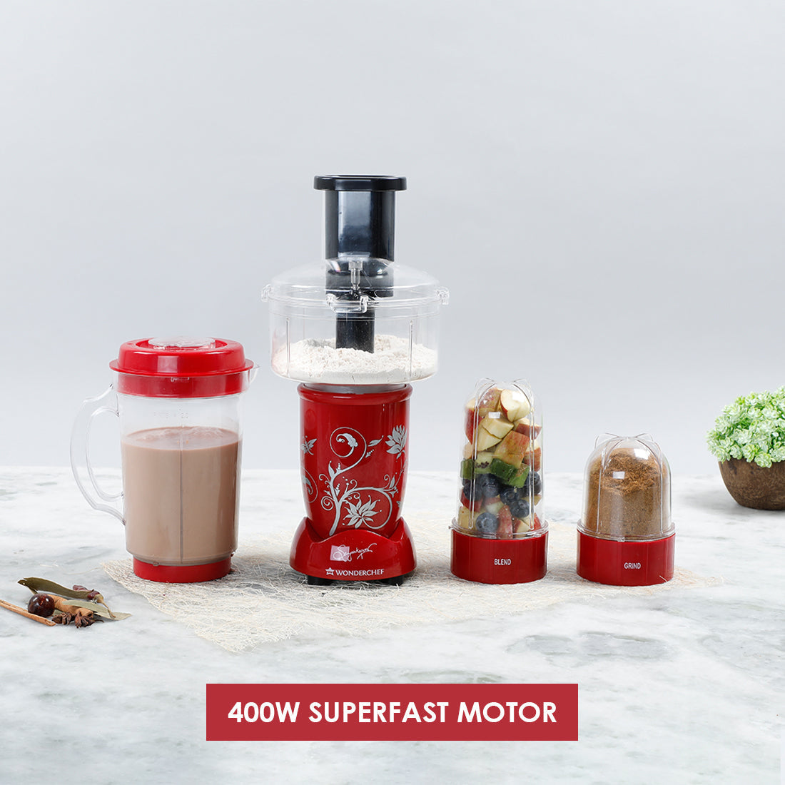 - Nutri – blend blend FP (Food Processor) comes with extra attachments – a big 1150 ml Juicer Jar, an exciting 800 ml Atta Kneader, offering an all-in-one solution that functions as a mixer, grinder, blender, juicer and atta kneader. The Long Jar (500ml) comes with 4-wing blade for mixing-blending and the Short Jar (300ml) with 2-wing flat blade for grinding to make all kinds of chutneys, shakes, smoothies and masalas. The blades are inter-changeable and can be used with the big jar too. The Food Processor has its own super-sharp chopping blade, and a steel disc for making slices &juliennes. Two useful lids – for storing and sprinkling come with the product