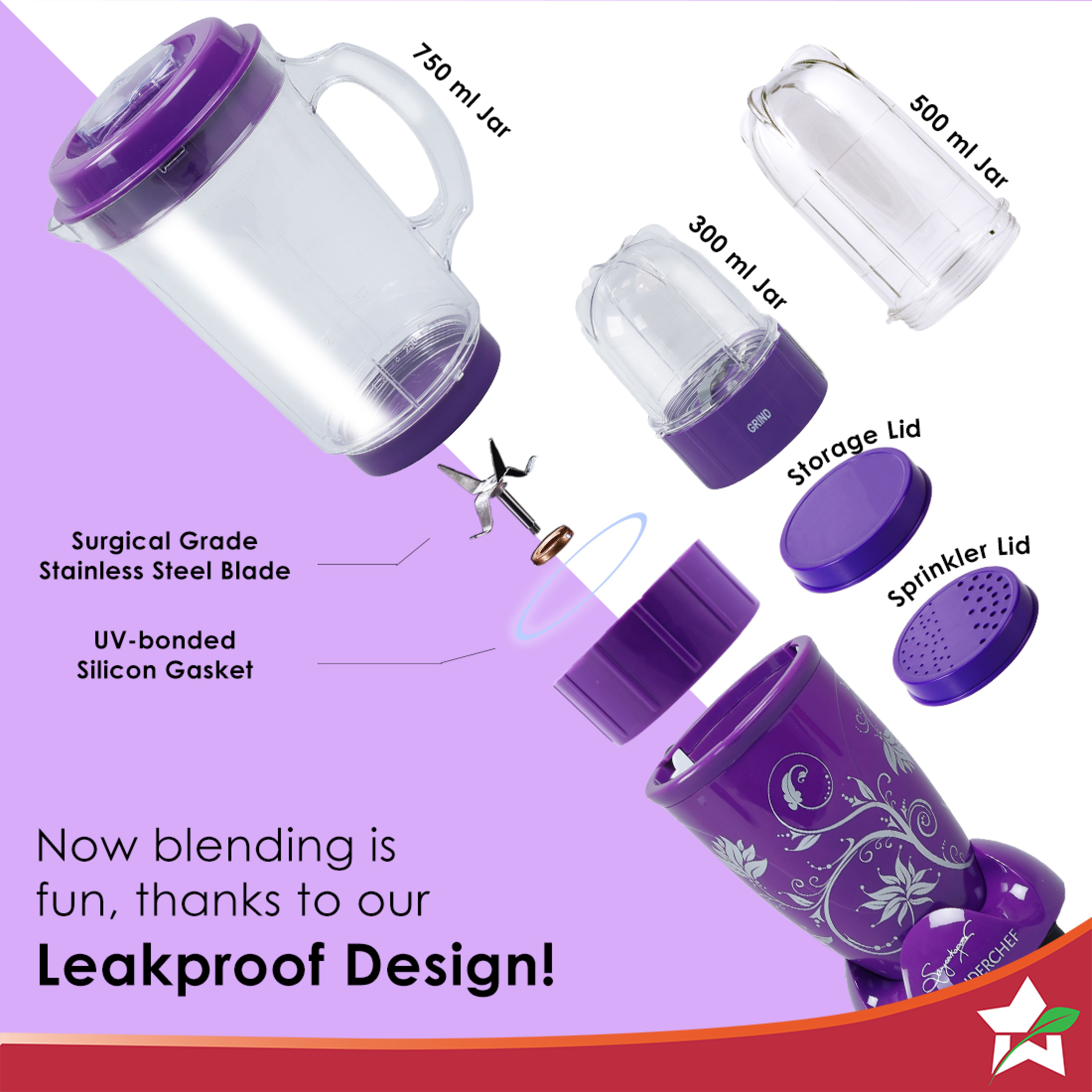 - Specialised Functions: The Long Jar (500ml) comes with 4-wing blade for mixing-blending and the Short Jar (300ml) with 2-wing flat blade for grinding to make all kinds of chutneys, shakes, smoothies and masalas. One useful lid – for storing and sprinkling comes with the product. Additional 750 ml Juicer Jar makes this product as multi-purpose machine for all the kitchens.