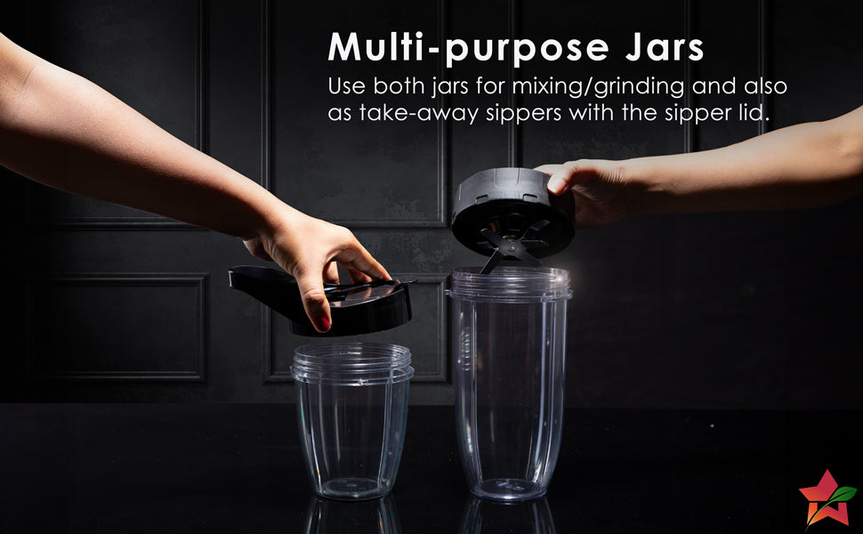 - Specialised Functions: Comes with 2 interchangeable unbreakable Tritan jars (Tall Jar – 1000ml & Short Jar 650ml), 1 storage lid and a special sipper lid that can be attached to any jar so you can carry your smoothie / shakes wherever you go.