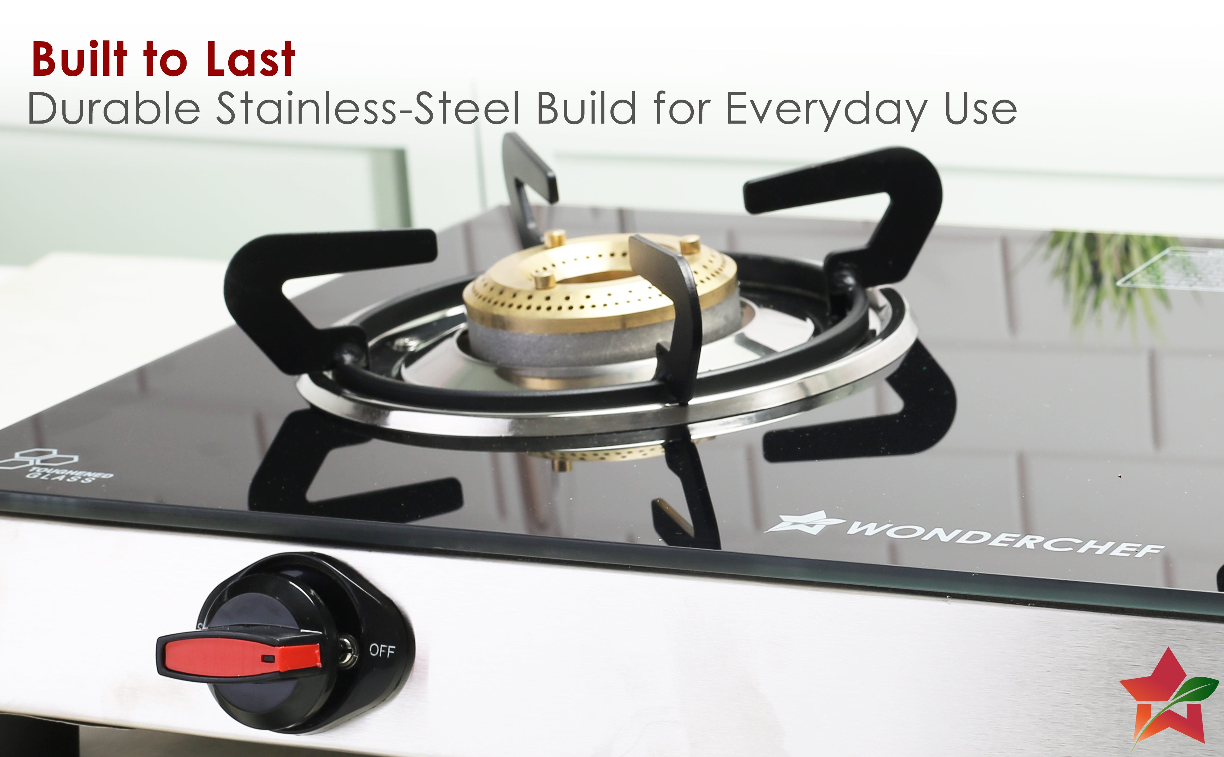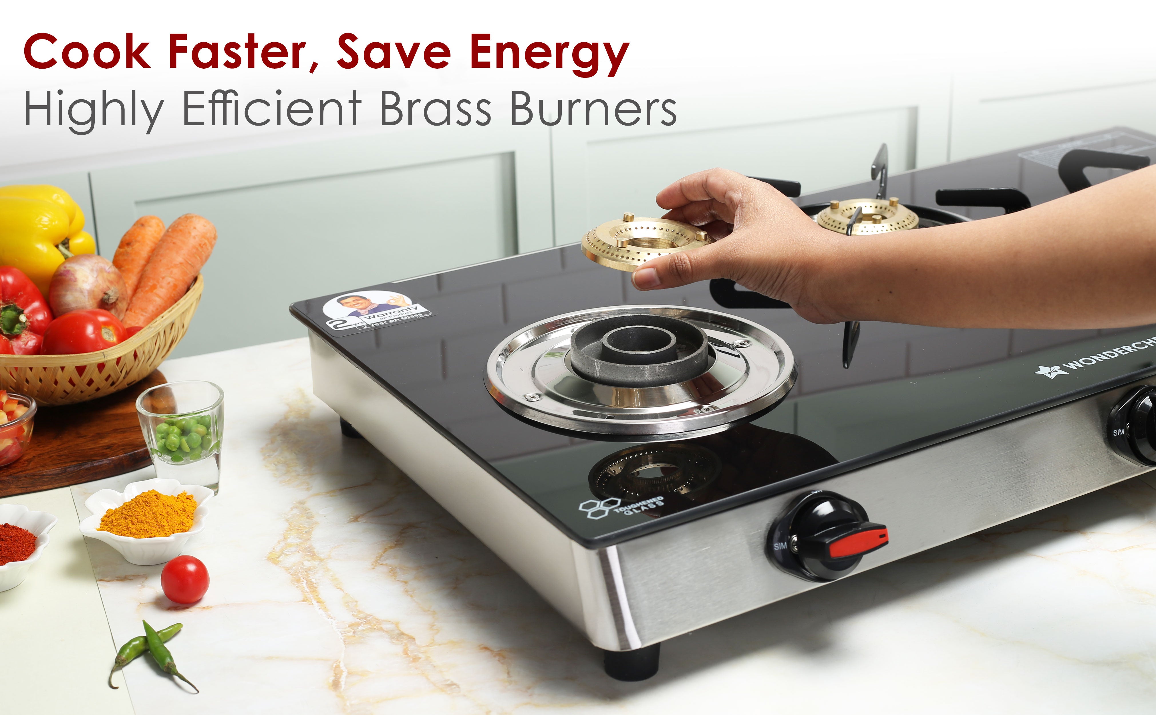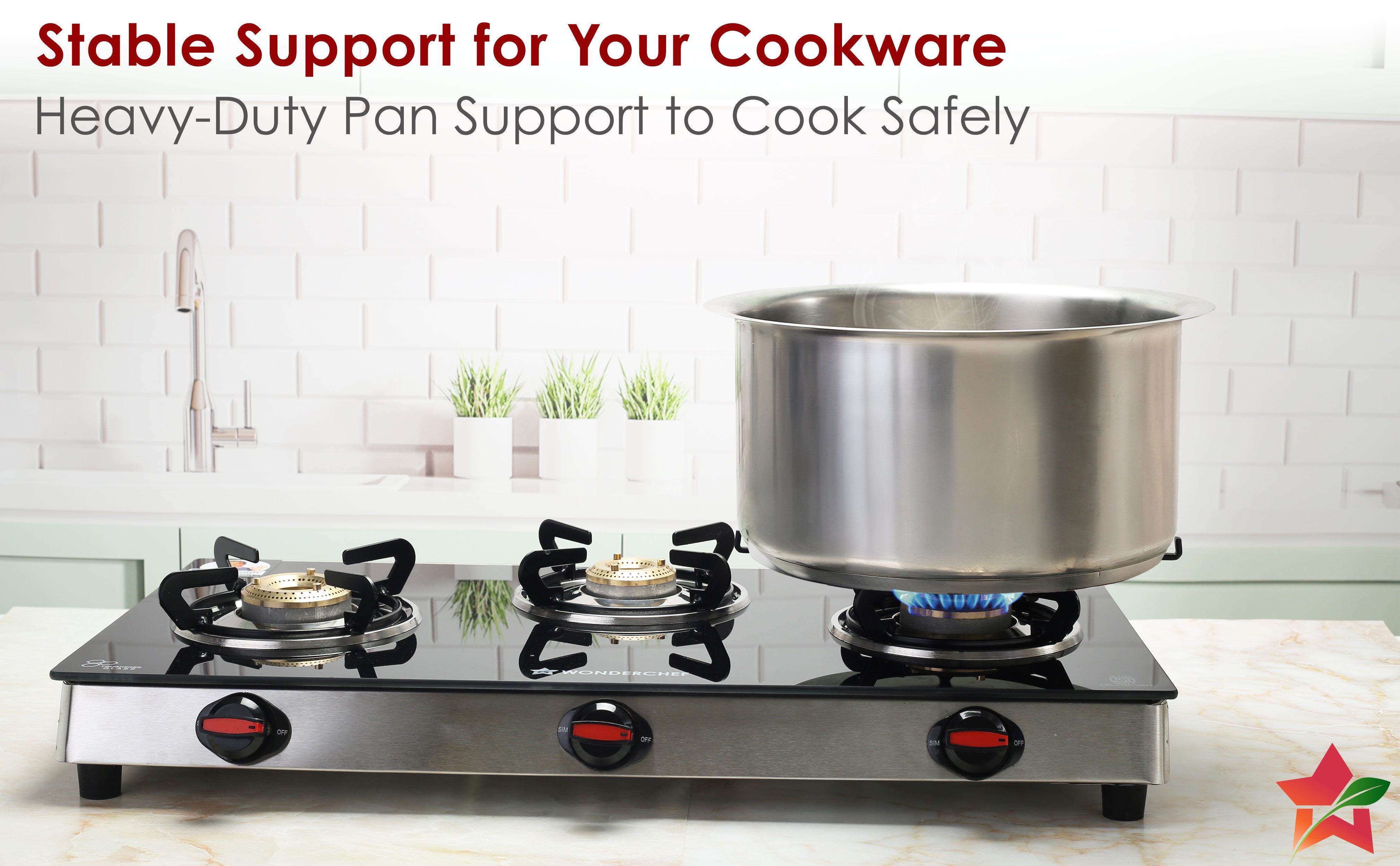- Efficient Cooking: Highly efficient tri-pin brass burners provide fuel-saving and uniform heating, allowing you to cook faster and more efficiently. 3 burners (2 medium, 1 small) cater to different cooking needs.