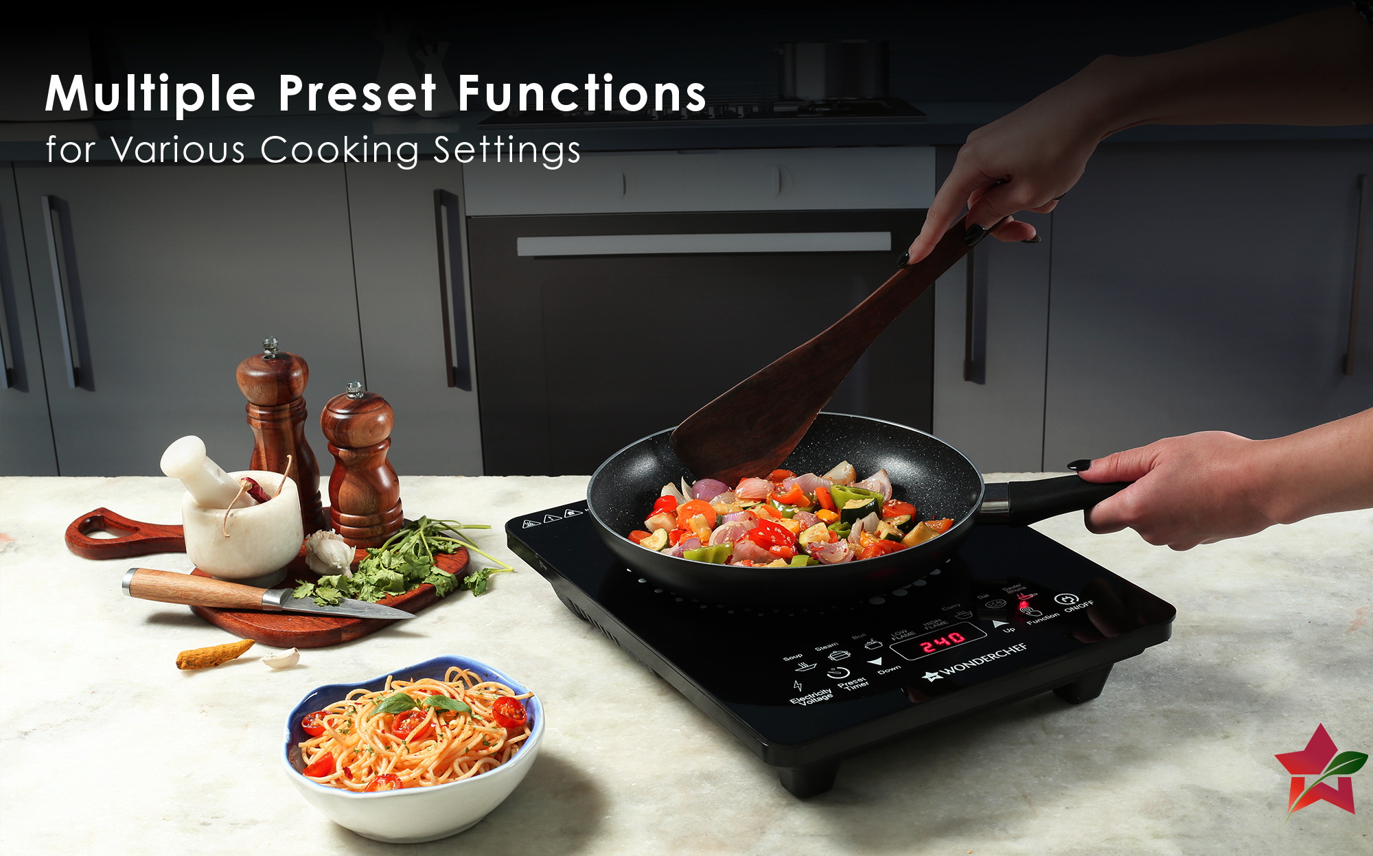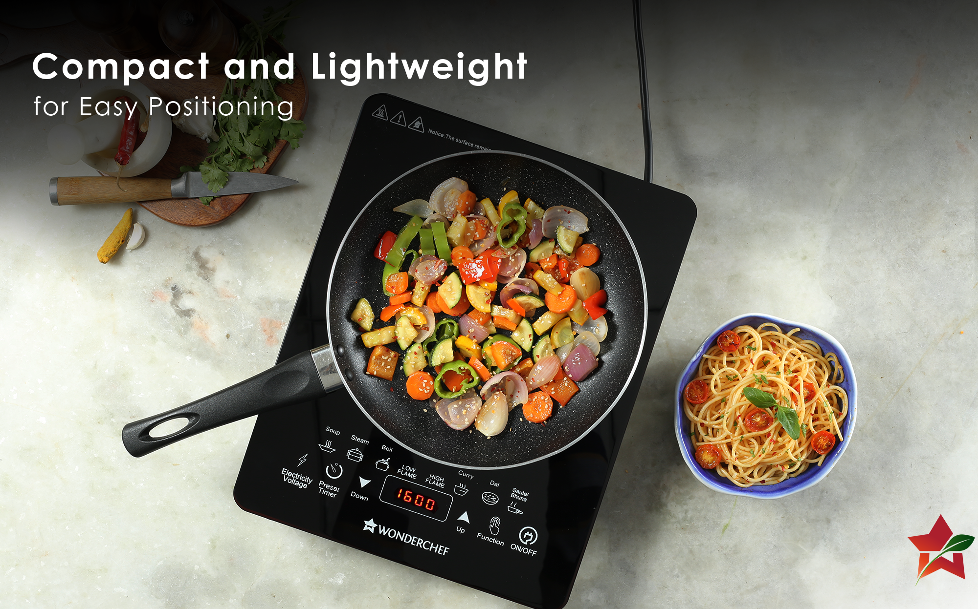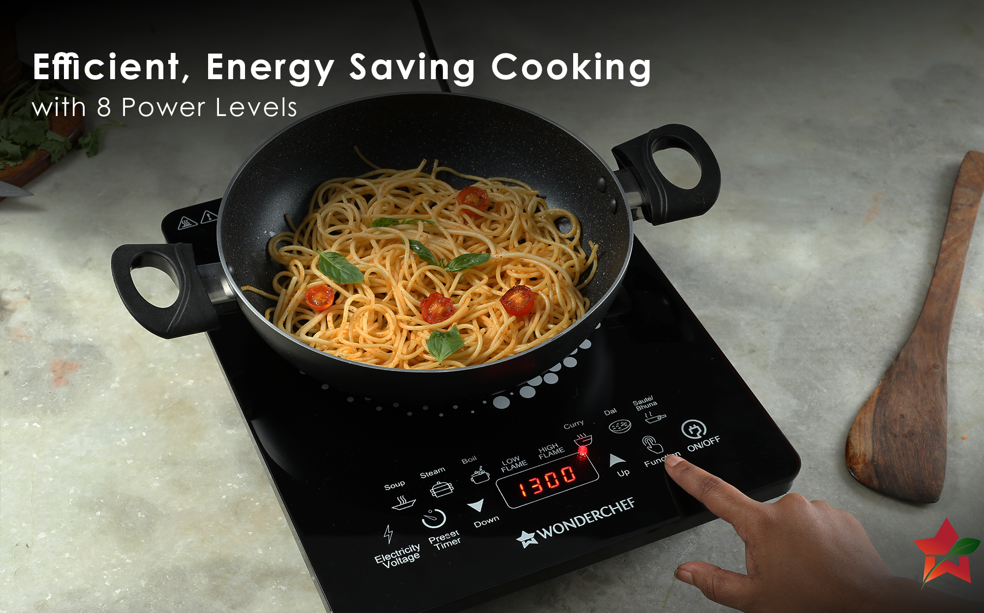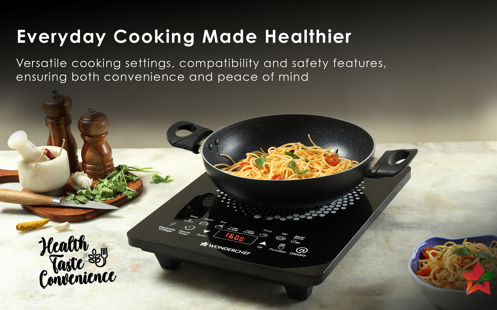- STYLISH DESIGN: Experience the ultimate convenience of cooking at home with the Wonderchef Swift Induction Cooktop. Designed to make your cooking process faster and more efficient, this cooktop offers high heating efficiency that allows you to cook your meals almost twice as fast as with a gas cooktop. By saving on fuel costs, you can enjoy rapid cooking without compromising on taste and quality.